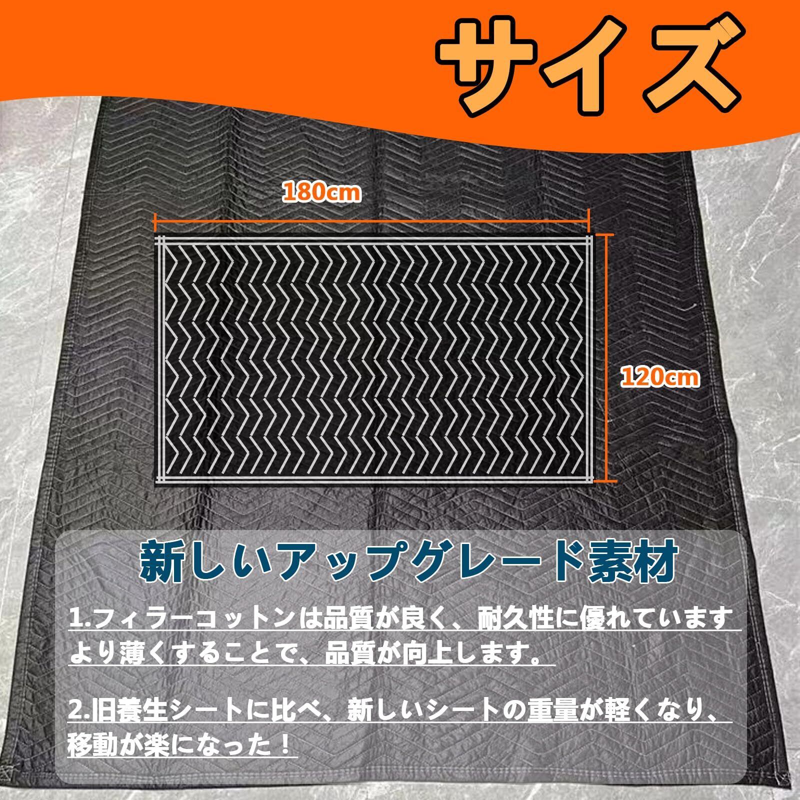 【商品仕様】養生クッションマットの素材:ポリエステル+綿。サイズ:180x120cm、重さ:0.9kg/枚、サイズと適度な厚さがあり、持ち運びも軽く、使いやすいです。【広い用途】大型ゴミを出す時とか、断捨離とかの時にまとめて荷物を出して選別する時に敷いたりとか、車の荷台の傷防止、DIY、作業、ピクニック、キャンプの敷物など、様々な養生シーンで活躍できます。