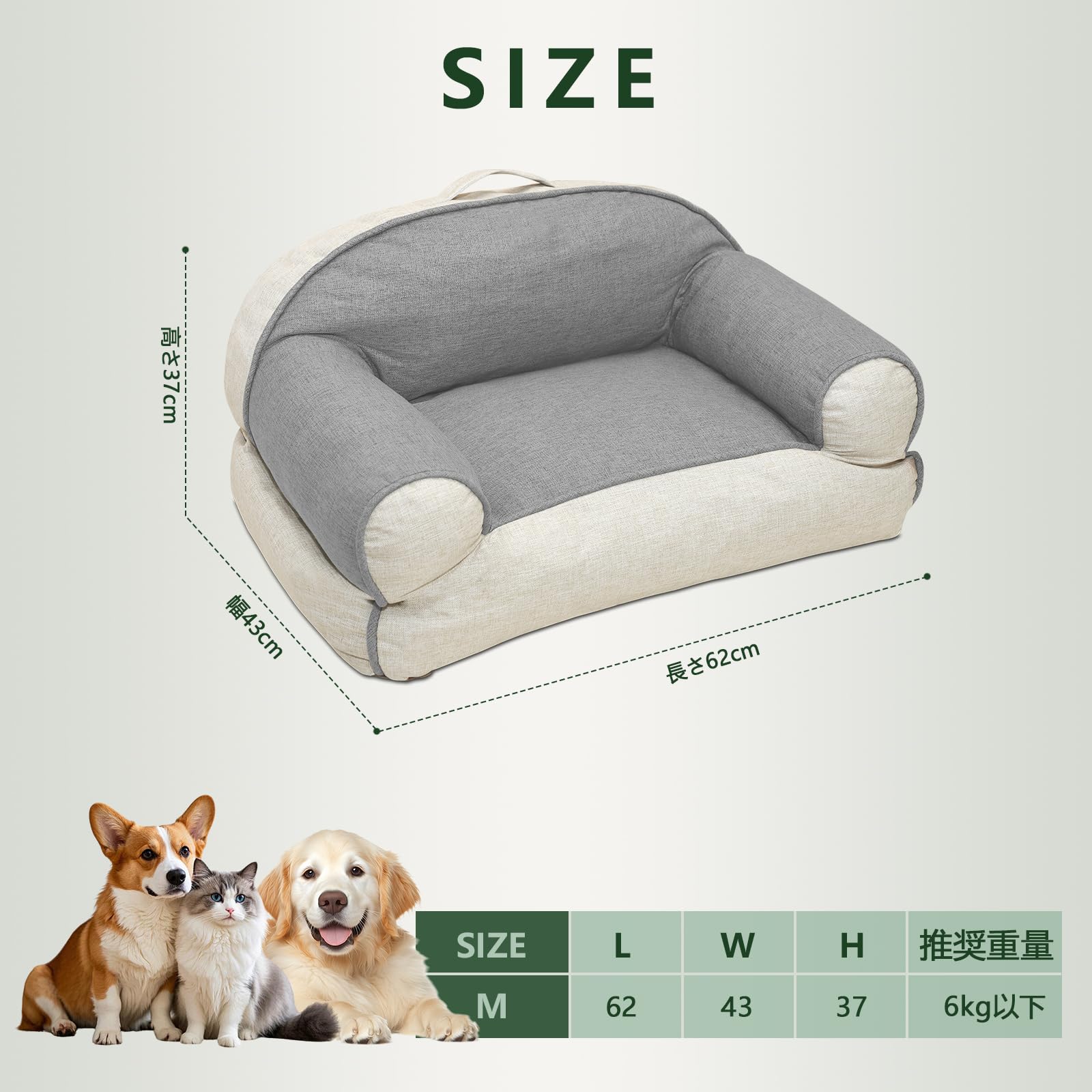 【ソファ型デザイン】ペットベッドは本格的なソファを再現したデザインです。両側の肘掛けがペットの安心感を高め、上部の取っ手付きで移動も簡単に行えます。Mサイズ(62×43×37cm)は成猫1匹まで余裕で収まる広さで、リビングに自然になじむおしゃれなペットベッドとしてご利用いただけます。