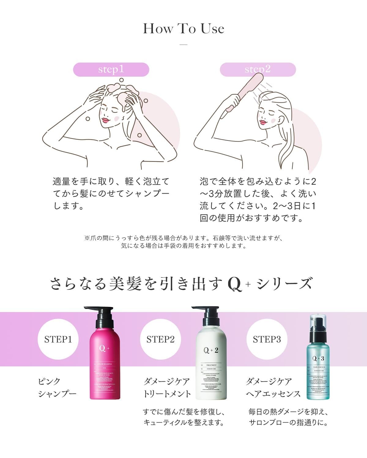 ✨【 サロン仕立ての髪色、そのままに。 】「カラーキープ×ダメージケア」を叶え、ツヤ感溢れるまとまり髪へ Q+( クオリタス ) のカラーシャンプー(ピンク)|●黄ばみやすい明るい髪色 ●色落ちしやすいピンクなどの暖色 の髪色にオススメ