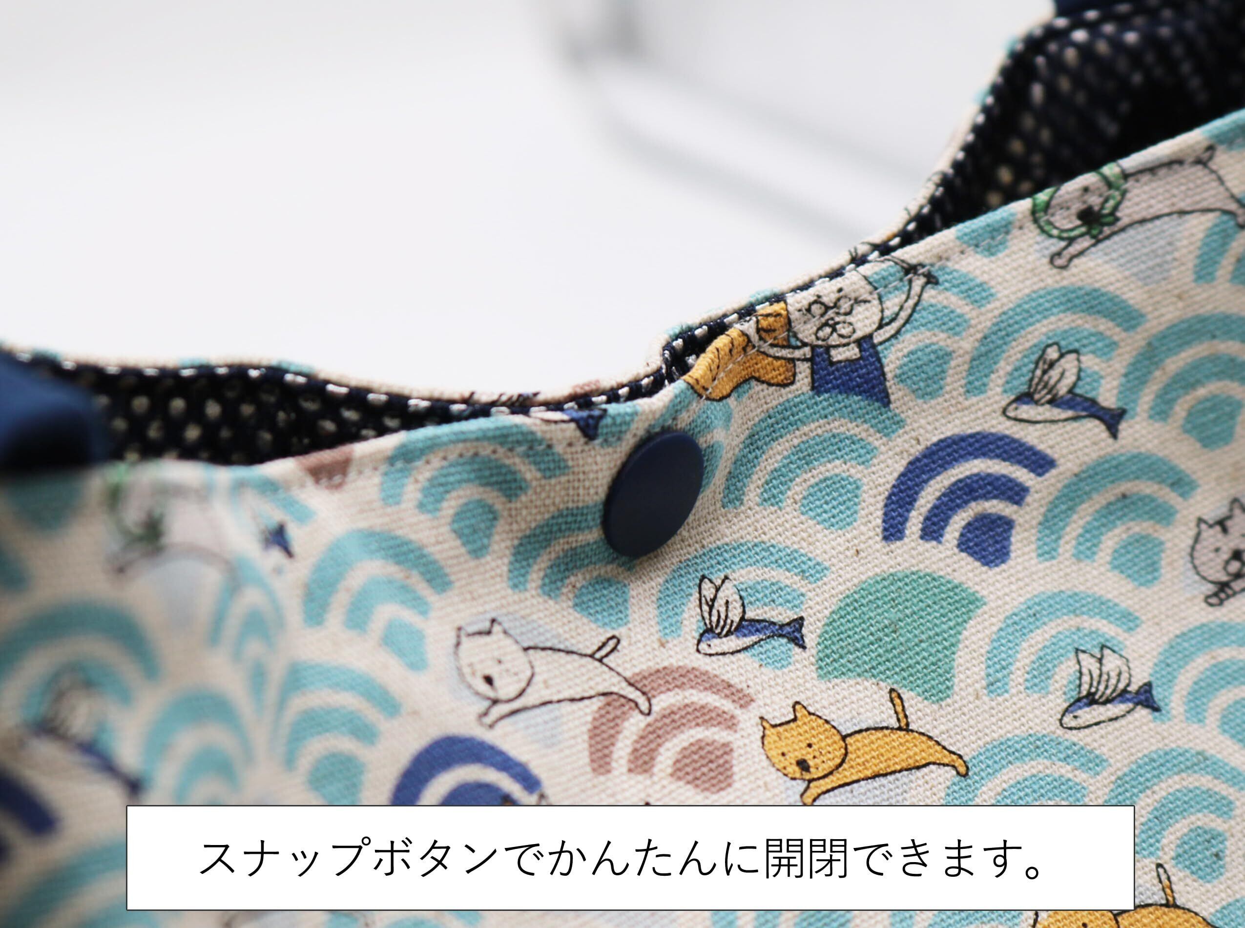 あづま袋風のお弁当袋で巾着袋のように紐がなく、紐なしの結ぶタイプです。スナップボタンで簡単に留められます。保冷保温ができるので夏は冷たく、冬は暖かく。お洗濯も可能で、生地は綿100%でサラッとしているので乾きやすく清潔に保てます。 一つずつ手作りでお作りしていますので柄の出方の違いや多少のサイズの誤差がございます。ご了承くださいませ。