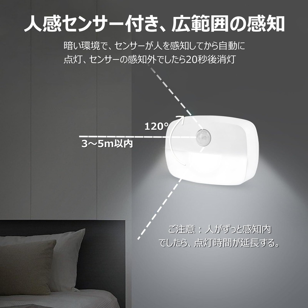 【感知範囲】暗くなると120°の広角範囲とおよそ3メートルの距離内の動きを検知したら点灯します。暗い室内や廊下、階段も、安心で危なげなく移動することができます。 ナイトライトとしても使います。