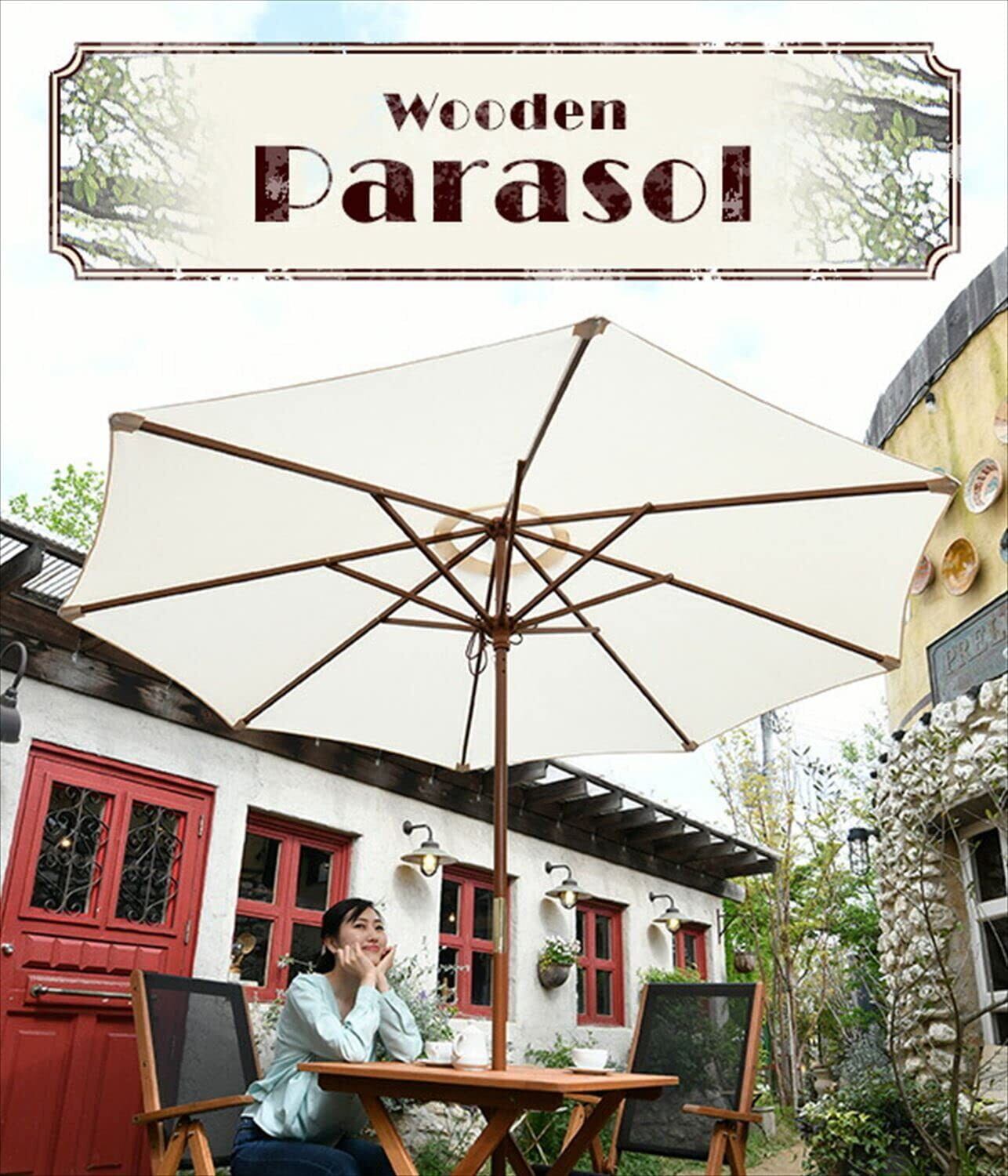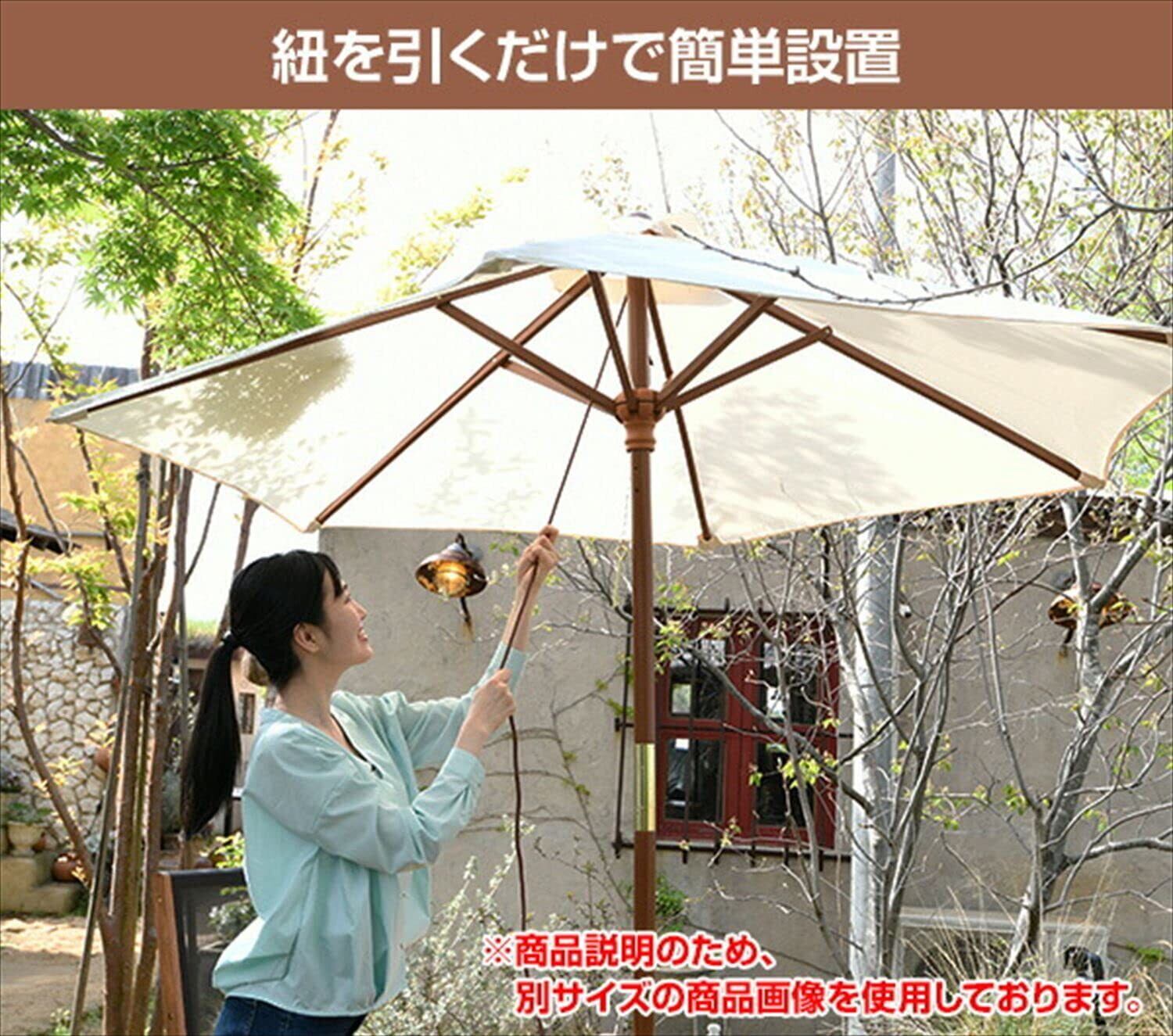 【特徴】お庭、ベランダ、バルコニーなどの日除けに便利な木製パラソルです(一部取付品)。紐を引くだけで簡単に設置できます。パラソルの開き具合はお好みで3段階調節できます。[直径約263/268/270cm] 雨にぬれても水を弾くので、お手入れも簡単です。