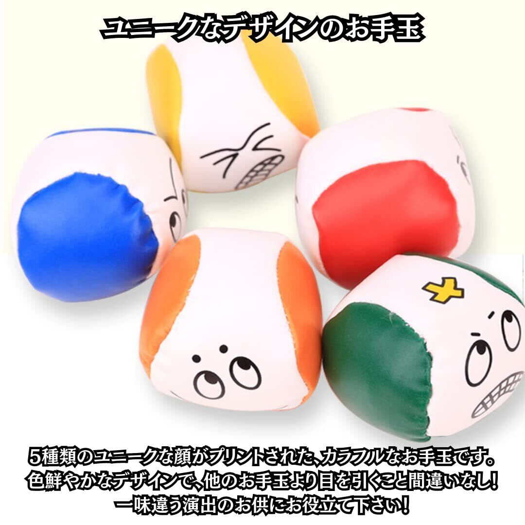 【ユニークなデザインのお手玉】5種類のユニークな顔がプリントされた、カラフルなジャグリングボールです。色鮮やかで楽しいデザインなので、他のお手玉より目を引くこと間違いなし!一味違う演出のお供にお役立て下さい!