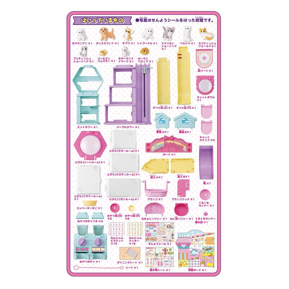 【セット内容】わんにゃんシェアハウス(1),ペット(11),おやつガチャ(1),おやつ皿(大)(5),おやつ皿(小)(5),わんにゃんビスケット(15),わんにゃんクッキー(15),ねこ耳ソファー(1),なかよしソファー(1),リード(1),ダイニングシート(1),背景ボード(1),せんようシール(1),紙小物シート(1),
