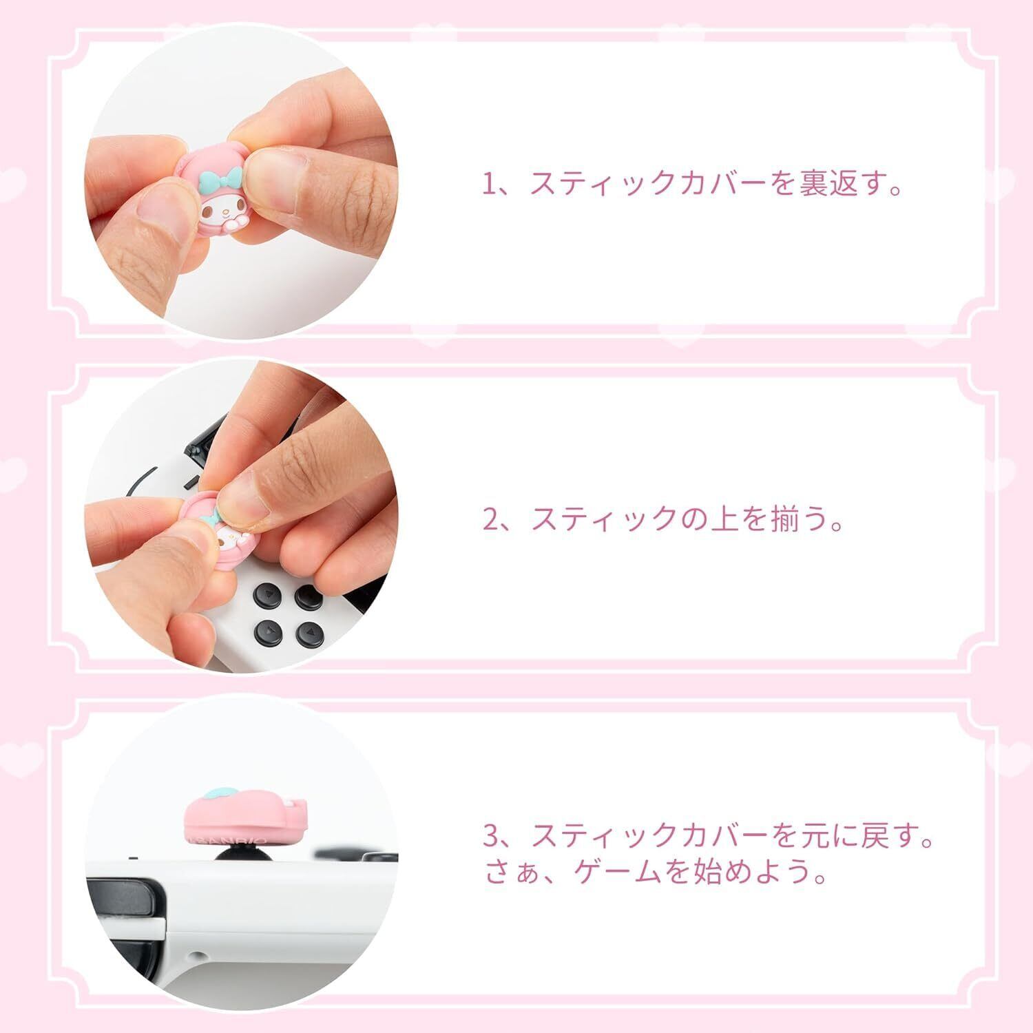 【簡単取り付けで即プレイ】工具不要で簡単に取り付けられるデザイン。 1.スティックカバーを裏返す。 2.スティックの上に揃う。3.スティックカバーを元に戻す。4.装着完了!誰でもすぐに使用できます。