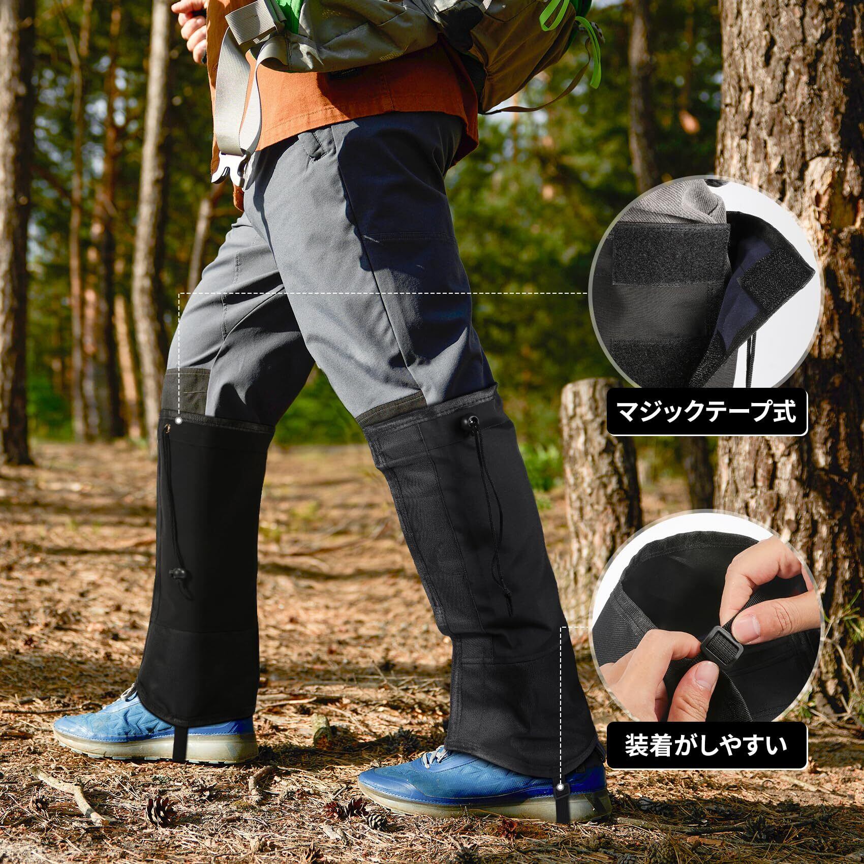 調整できるデザイン:上部の引き紐と底部のストラップで締め加減を調整できる登山用 スパッツです。上部の引き紐はしっかりと密閉し、下部のストラップは足のサイズに合わせて調整でき、足にしっかりフィットします