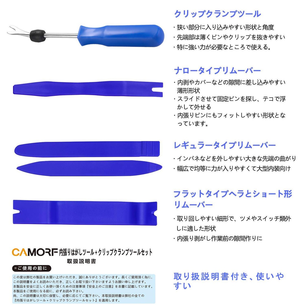 CAMORF 内張りはがし 車 内装はがし 車 内張りはがし セット うちばりはがし 車 内装剥がし 配線通し 樹脂製 車 内張り はがし 工具 脱着工具 車メンテナンス 家具パネルにも対応 内張り剥がし4点+ クリップクランプツール(ブルー) 5点セット 配線ガイド付き+収納袋