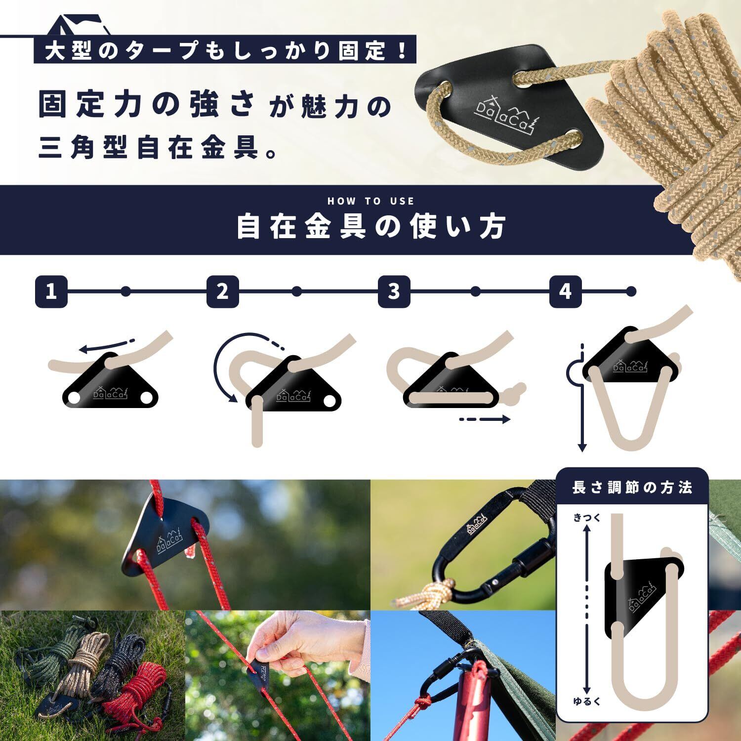 <業界最高水準の強度>ロープの材質は劣化に強い1000Dポリエステルです。耐荷重は300kg以上(弊社で計測済み)!どんな悪天候やどんな場所でも4mm設計のDaLaCaロープがテントやタープをしっかりと固定します。