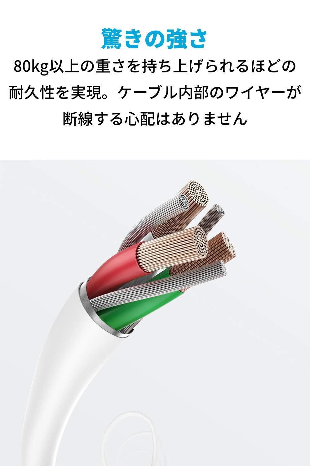 数が示すその強さ:一般的なケーブルより12倍以上の耐久性をもち、12000回以上の厳しい折り曲げテストもクリアしました。また、約80kg以上の重さを持ち上げられるほどに耐久性を実現。ケーブル内部のワイヤーを断線から保護し、安心して充電することができます。