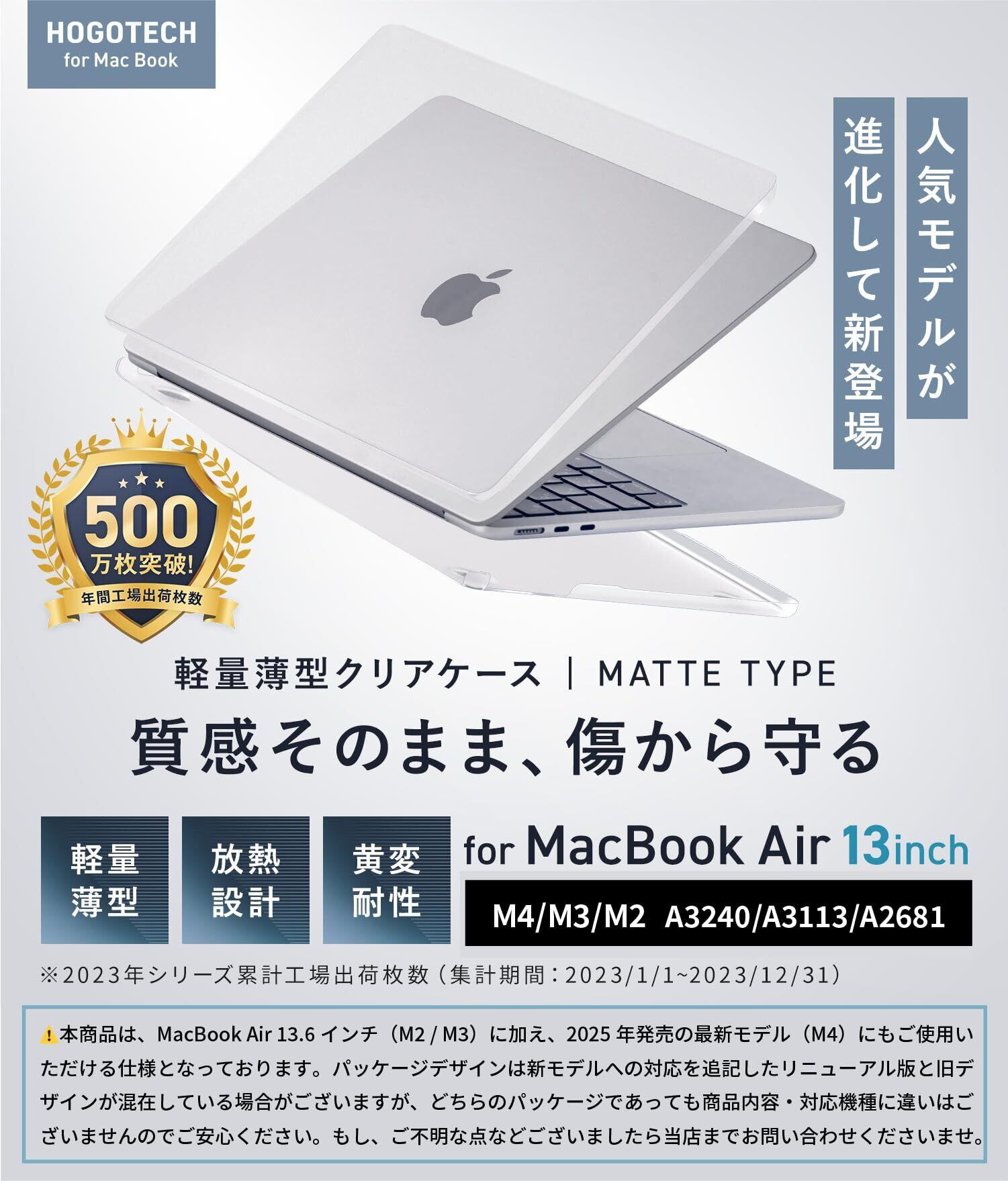 2025 M4対応【質感そのまま、傷を守る】MacBook Air 13インチ M3 / M2 ケース 2024 2022 カバー クリアマットカバー A3240 A3113 A2681 HOGOTECH