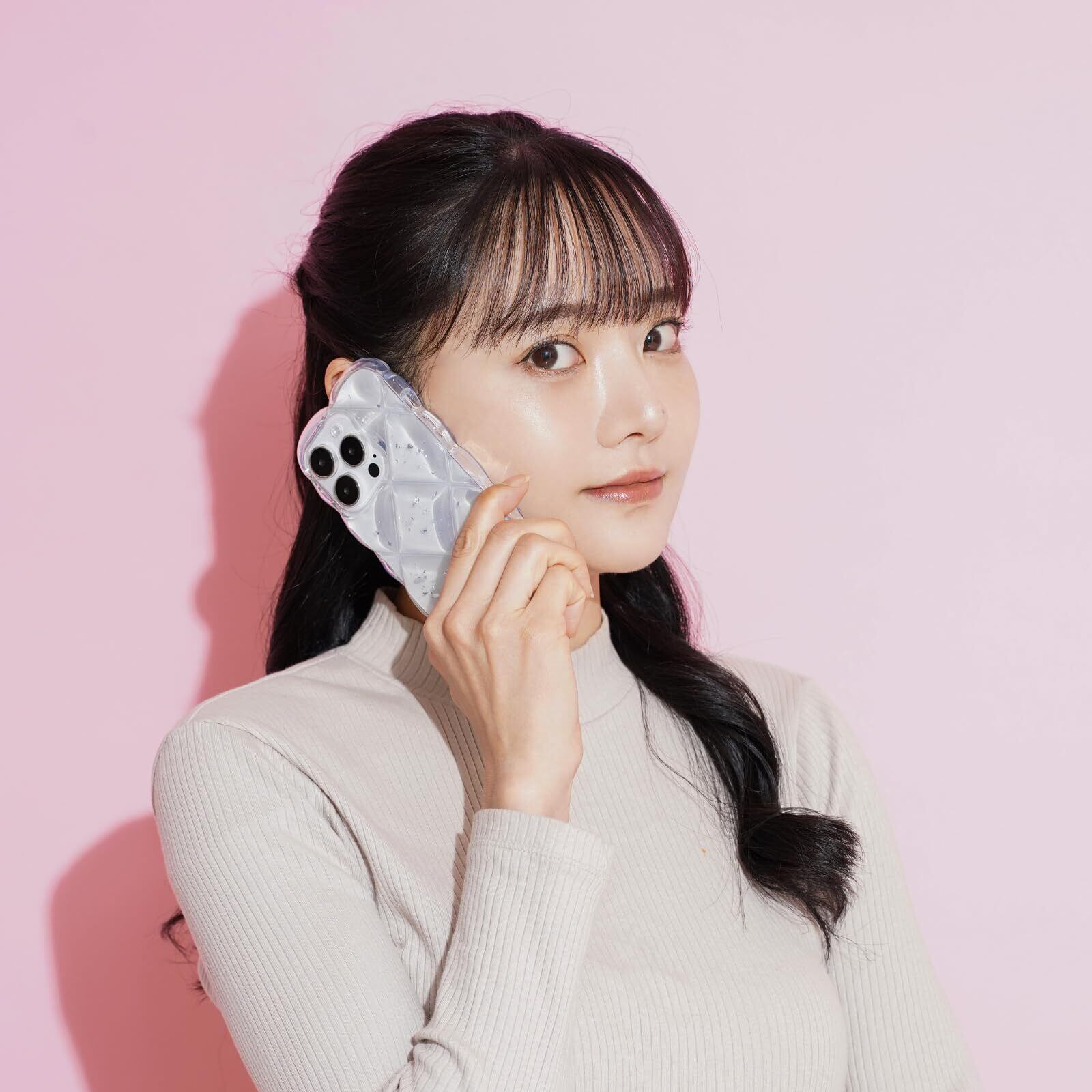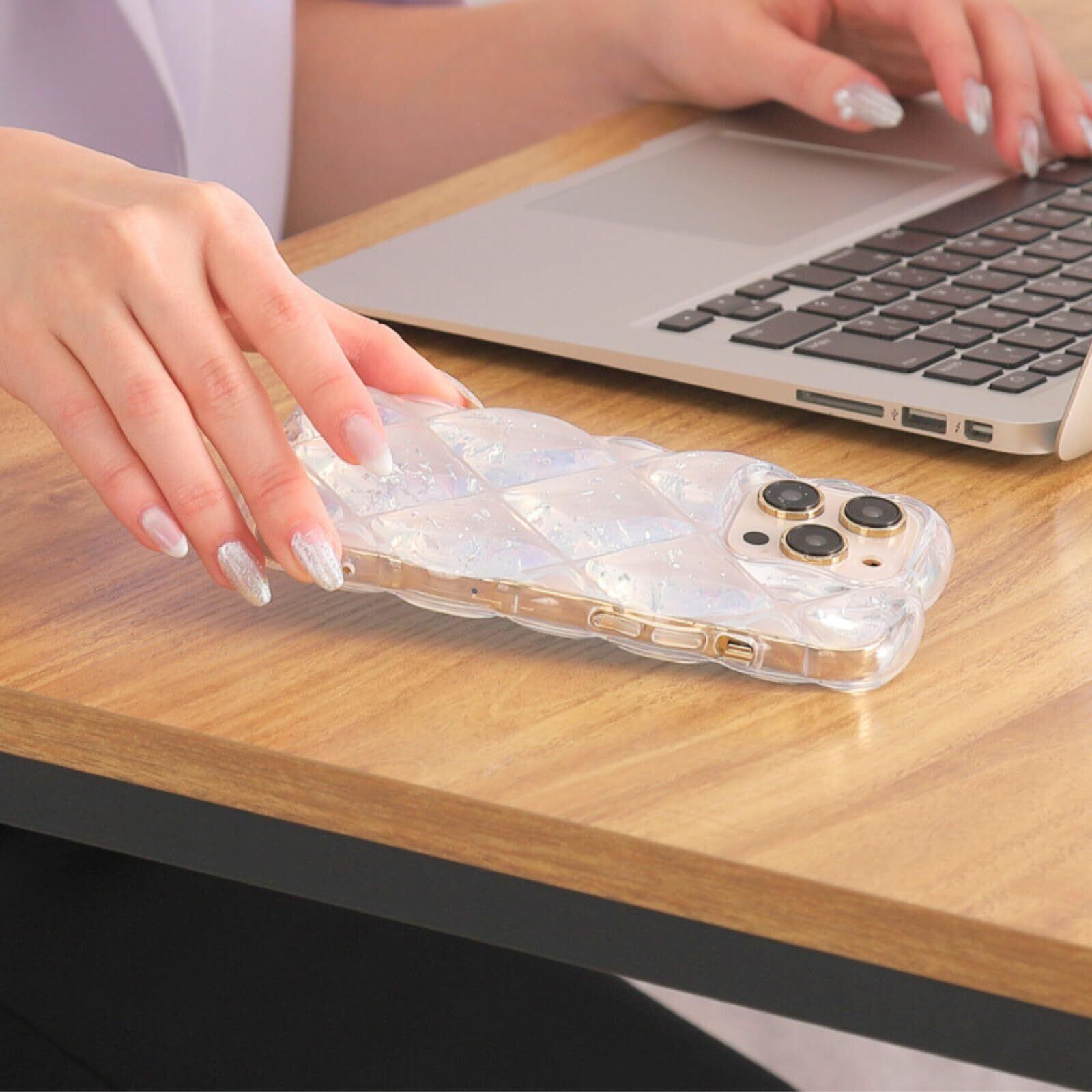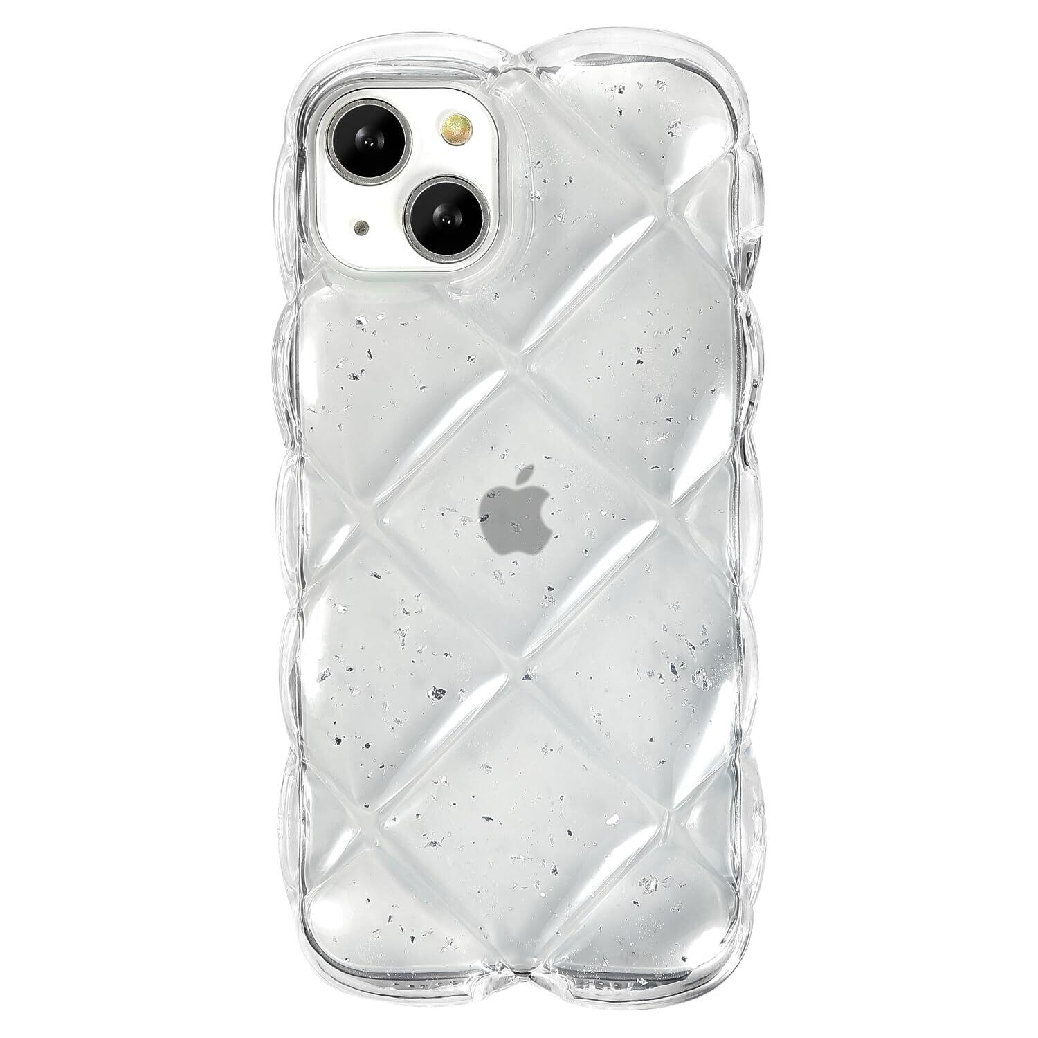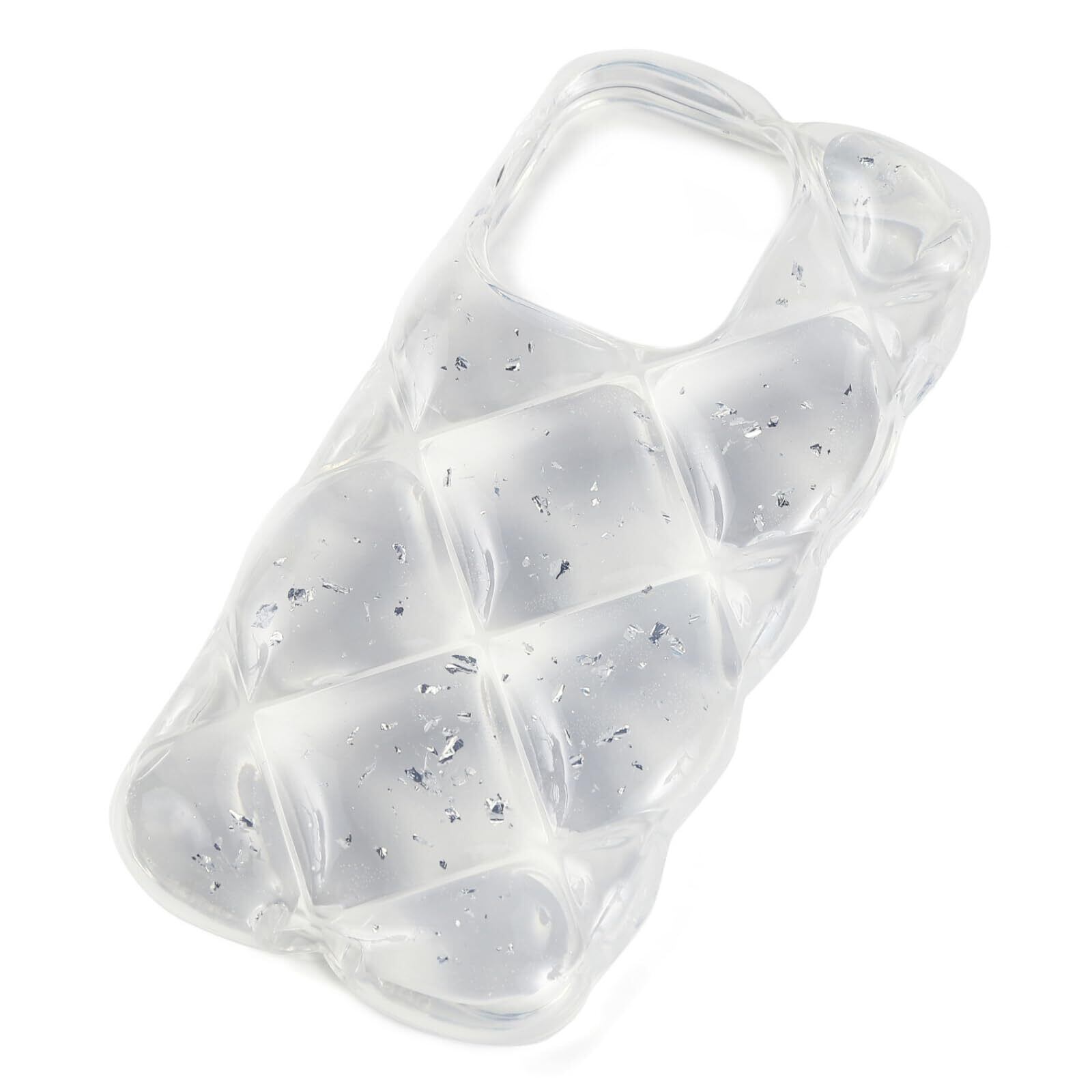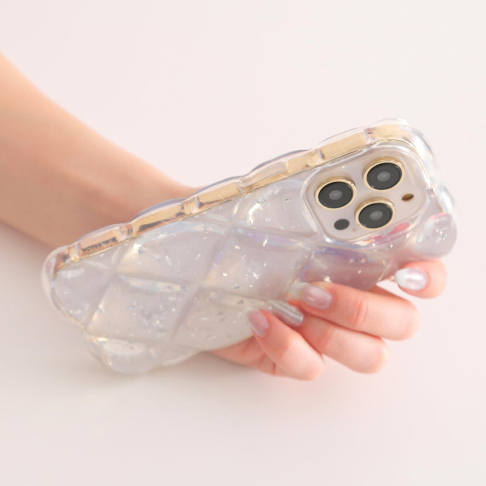 【今流行りのキルティングデザイン】 うねうねとしたエッジとダイヤ柄のひし形凸凹加工、アルミ箔シルバーの装飾を施した、大人可愛いiPhone用クリアケースです。シンプルながらもゴージャスな雰囲気を演出します。
