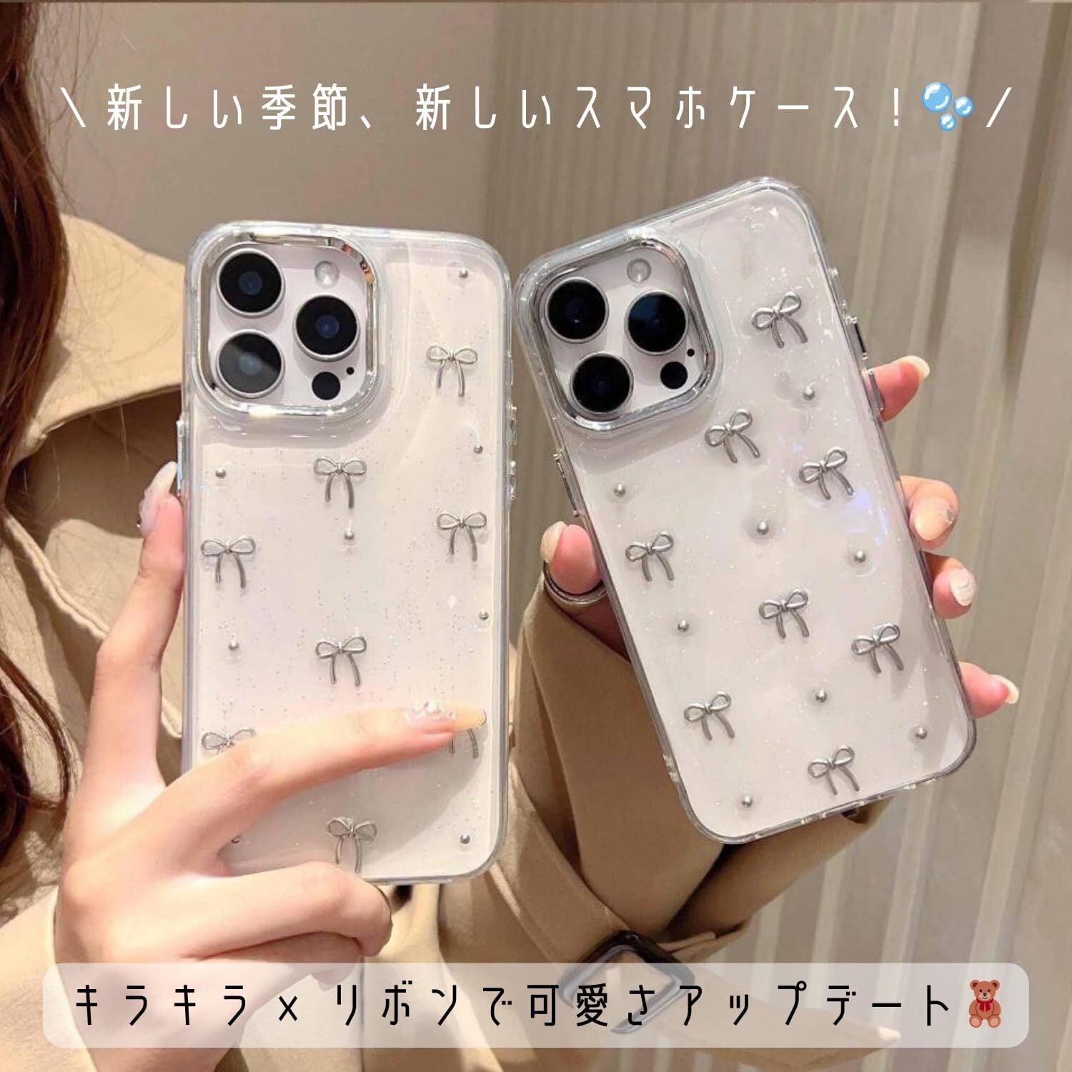✨【可愛さ×機能性】 柔らかいTPU素材で着脱簡単 シルバーの小さなリボン&キラキラのラメパウダーがポイント 上品さと可愛さを兼ね備えた、流行の韓国デザイン✨