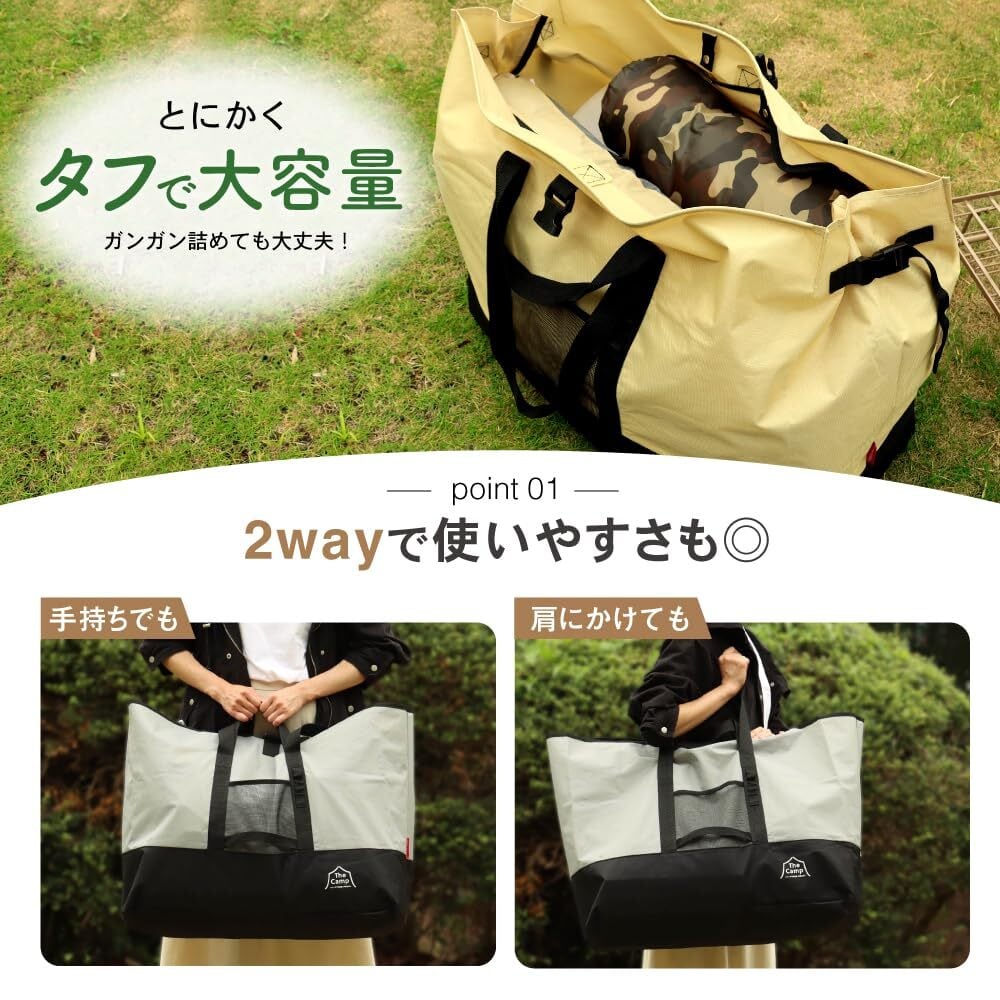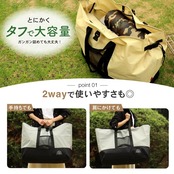【ギアもガンガン詰め込める!キャンプで活躍の大型収納バッグ】頑丈で大容量なだけでなく、ギアの運搬をよりスムーズにするディティールを備えた高い機能性トートバッグです。テントや寝袋などの大きなギアも入るので、お気に入りのギアをたっぷりと持って行くことができ、あなたのアウトドアライフをより充実させます。収納袋付きなので、使用後はコンパクトに折りたたんで収納することができます。