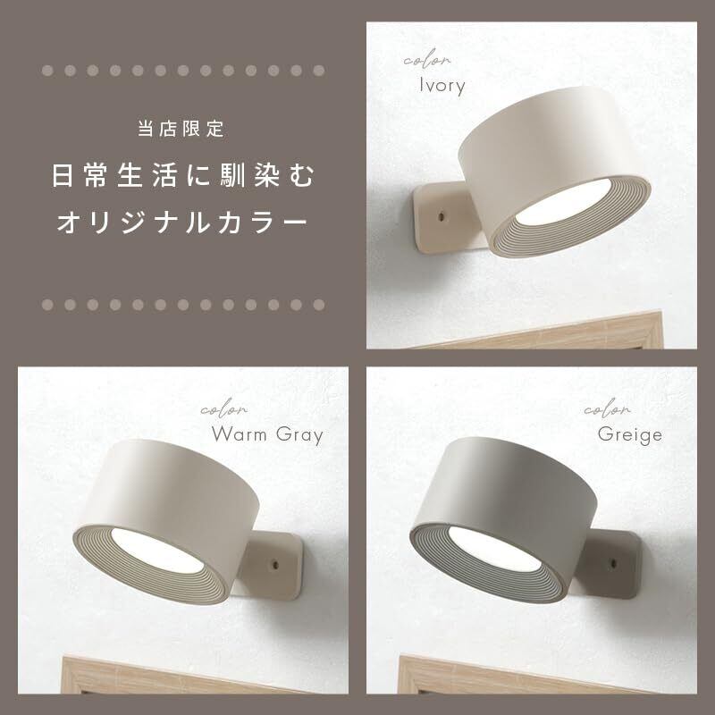 【ここにしかない店舗オリジナルのおしゃれなカラバリ】atRise[アットライズ]の商品ページをご覧いただきありがとうございます。このブラケットライトは360°自由に回すことのできるウォールライトです。 スタッフが特にこだわったのが「色」お部屋になじむけど、おしゃれになる。そんなカラーを選別しました。 カラーバリエーションは3種類 [アイボリー・ウォームグレー・グレージュ]の中からお選びいただけます。 お部屋や洗面所のあかりとして、また模様替え時のワンポイントとして、ぜひご検討ください。