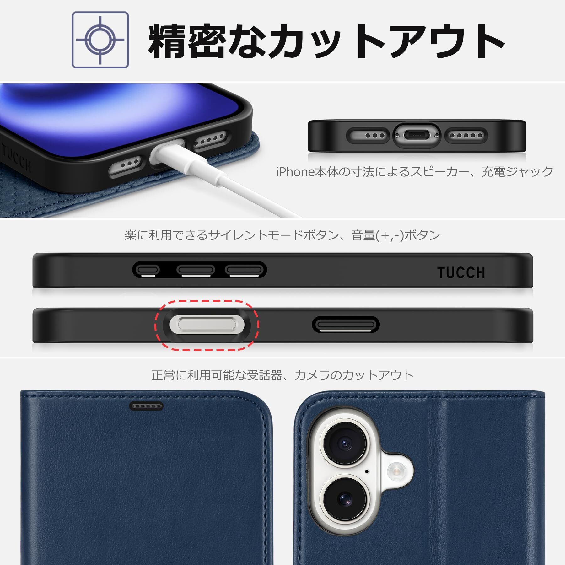 TUCCH iPhone16 対応 ケース 手帳型 アイフォーン16 手帳 ケース カード収納 横置きスタンド機能 [RFIDブロッキング] 衝撃吸収 全面保護 TPU素材 PU合皮 あいふぉん16携帯カバー (2024年発売 6.1インチ アイフォン16 5G 対応) ダークブルー
