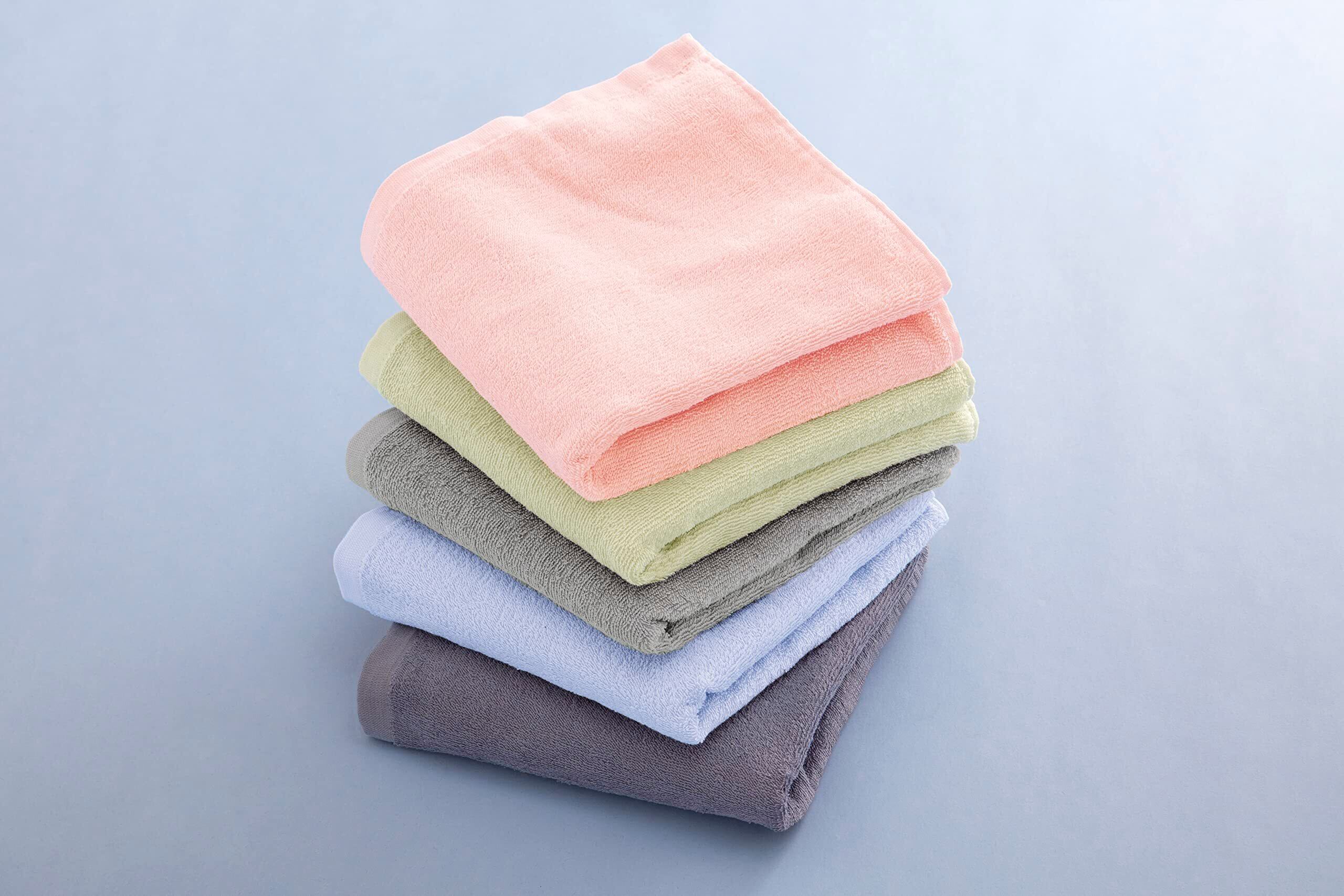 飽きのこない無地カラーの5色セット。薄手なのに丈夫なので、業務用や一般のご家庭でもお使いになりやすいコストパフォーマンスの良いタオルです。