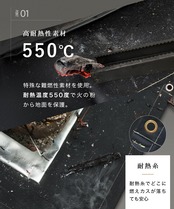 ️素材:シリコン加工ガラス繊維。シリコン加工によって、ガラス繊維特有の手に感じるチクチクとした痛みはなく、手触りが良いためガラス繊維が苦手な敏感肌のユーザーにおすすめのシートです。また撥水性もあるので地面が濡れた場所でも使用可能で水洗いもできます。️ 縫製に使用する糸も難燃性のものを使っているので糸の部分に火の粉が落ちても糸が切れることはありません。
