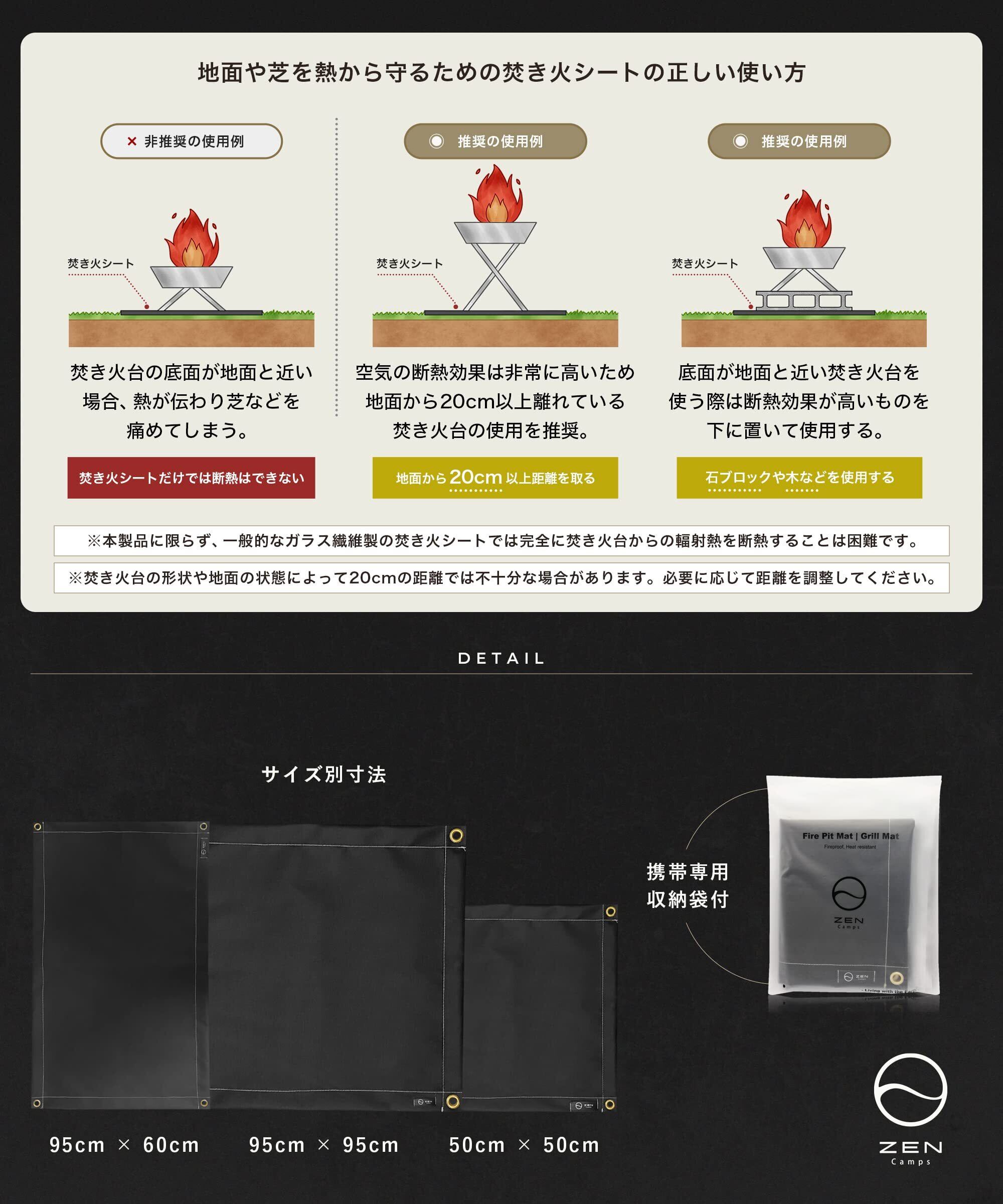 ZEN Camps 焚き火シート スパッタシート 焚き火台シート チクチクしない シリコン ブラック 黒 耐火 耐熱 防炎 防火 シート キャンプ 芝生保護【日本ブランド】