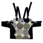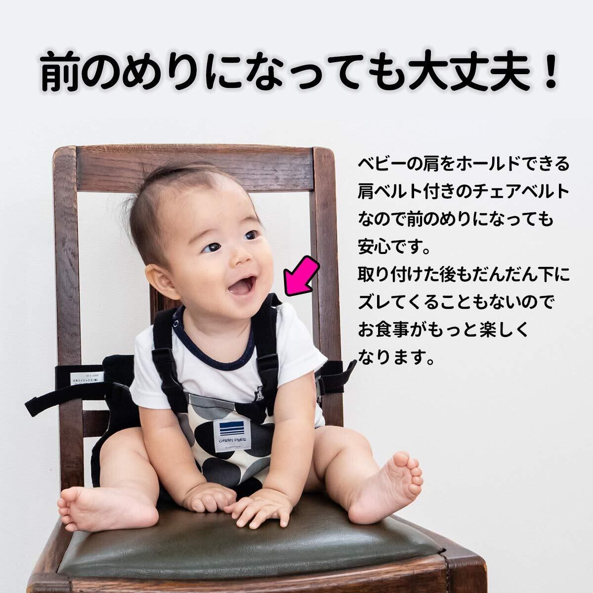 外出先のレストランのハイチェアーや公園のベンチ、帰省先のイスなどに取り付けて、お子様が落ちないようにする安全補助ベルト。大人の膝の上に装着すれば両手が空いてお食事サポートが楽にできます。