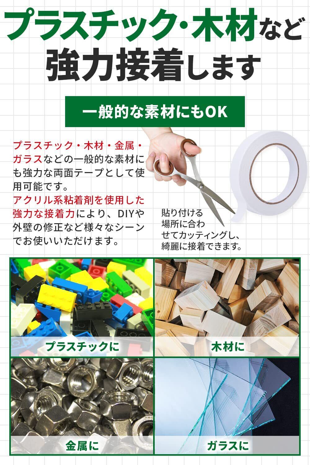【 自由自在にカンタンカット 】 両面テープなので、貼り付ける場所に合わせたカッティングにより、カンタン加工ができます。接着剤などにありがちな、はみ出しや汚れなどなく綺麗に接着することが可能です。