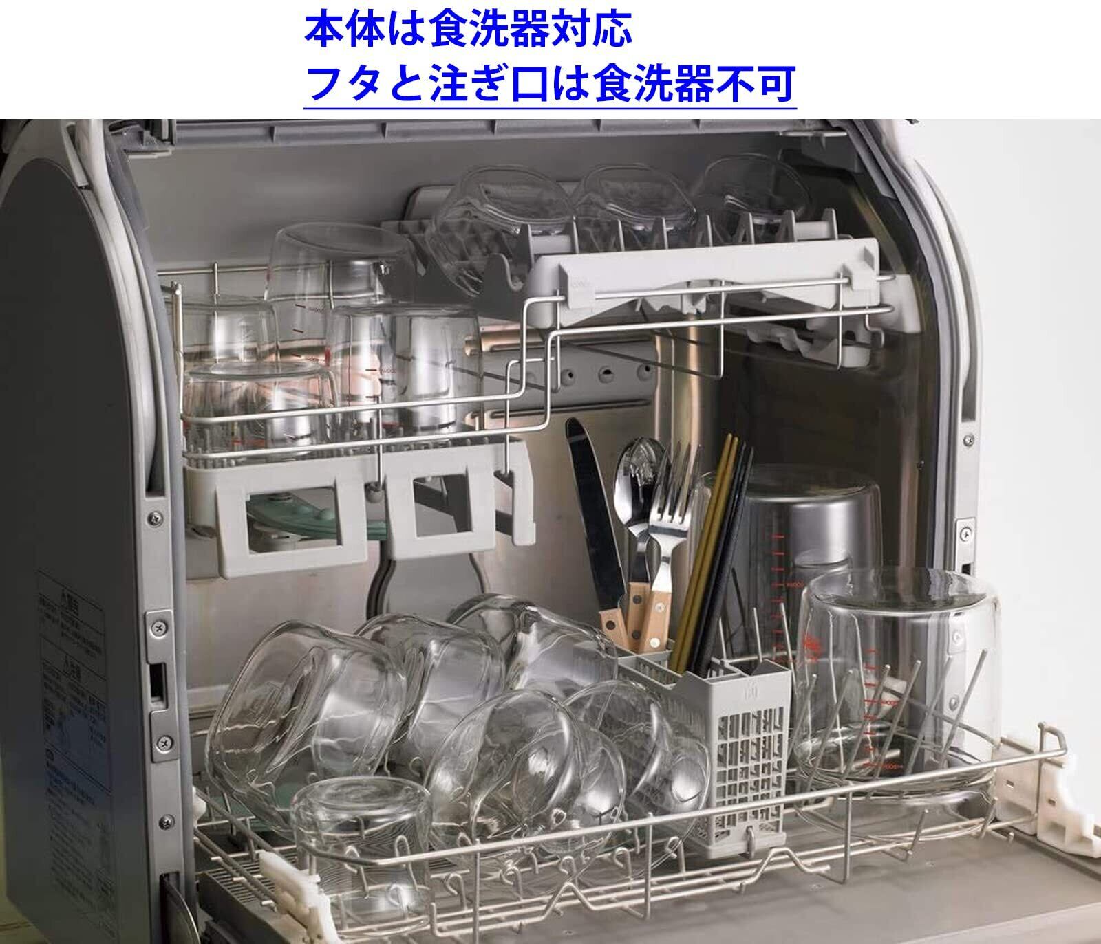素材・材質:本体/耐熱ガラス、フタ/AS樹脂(耐熱温度90度)、パッキン/シリコーンゴム(耐熱温度200度)、注ぎ口/ポリプロピレン(耐熱温度120度)