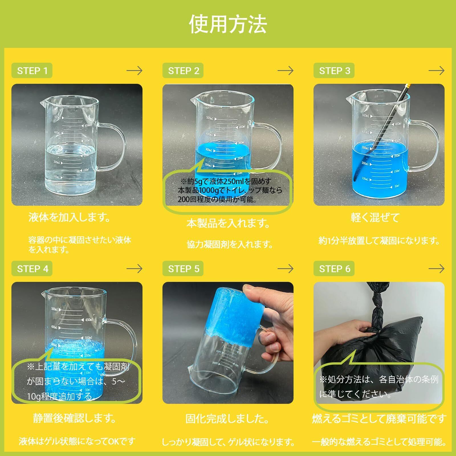 【使用方法】凝固させたい液体の上に本品を適量に入れます。約5g/250m。液体の中に入れて、混ざた後約5-10分静置します。固めしにくい場合、またすこし入れてください。凝固時間はと使用量は液体にある異物の量と塩分により多少異なります。 ※トイレ用なら200回程度、使用可能(1回を250mlと想定)固めたものは、一般の可燃ゴミとして処理可能です。ただし、処理の際にはお住まいの行政自治体の方針に従ってください。