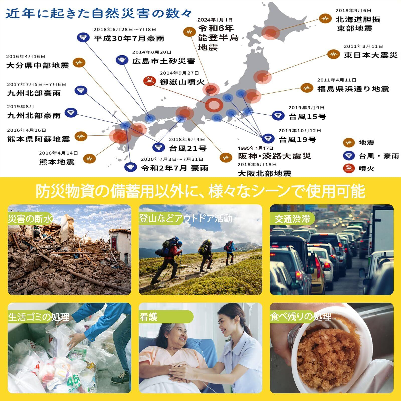 【消臭力抜群】水を使うことできない非常用トイレを利用する際に最も気になるのは臭い(5大悪臭)です。当社の凝固剤は、消臭特性を持つ吸収性ポリマーにレモンの消臭剤を豊富にブレンドしたものです。この製品は液体や排泄物の浄化作用があり、高い消臭効果を発揮します。これにより、緊急時の心理的ストレスを軽減し、快適に使用できる環境を提供します。