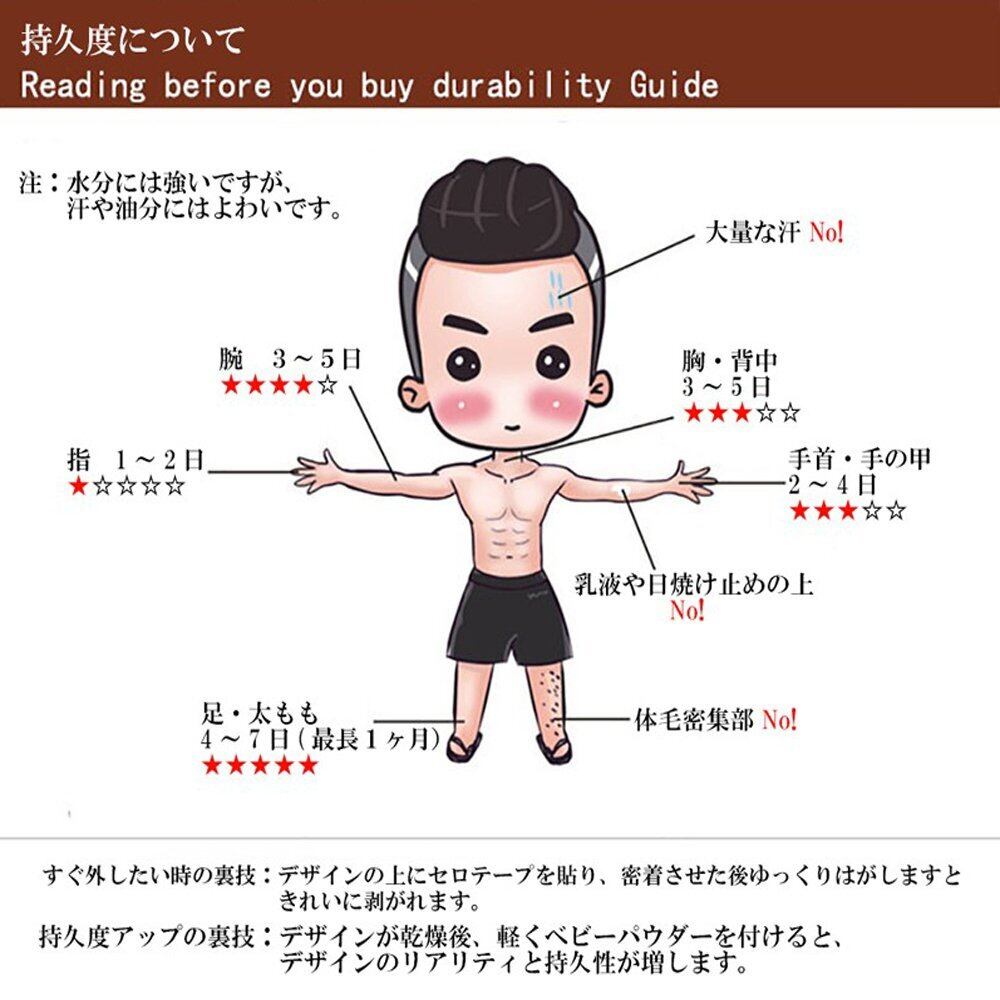 【持ち時間】防水加工のため、お風呂など通常は4-7日程度保つ事が出来ます。 手足等のよく動かす所と間接部分は1,2日程度が目安です。