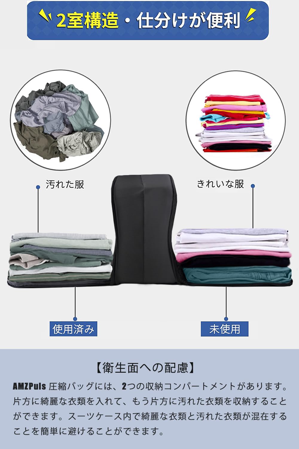 【衛生面への配慮 & 2Way スペース】AMZPuls 圧縮バッグには、2つの収納コンパートメントがあります。片方に綺麗な衣類を入れて、もう片方に汚れた衣類を収納することができます。スーツケース内で綺麗な衣類と汚れた衣類が混在することを簡単に避けることができます。ナイロン素材だからビニール製の圧縮バッグのように中身が見える心配がありません。ふいにキャリーケースを開ける場面でも安心です。