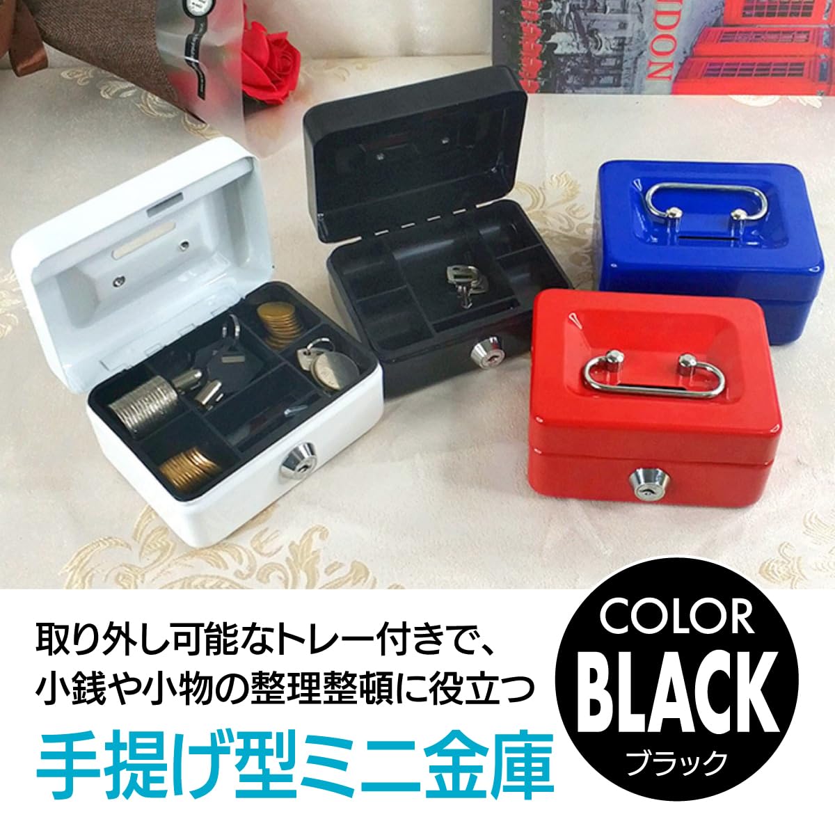 スチール製の手提げ型ミニ金庫です。取り外し可能なトレー付きで、小銭や小物の整理整頓に役立ちます。
