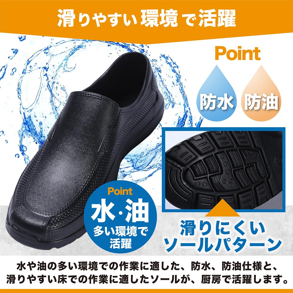 【防水&防油】水や油の多い厨房を想定して防水&防油でソールは滑りにくい形状に。