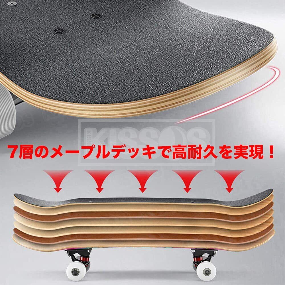 コンプリート(完成品)なので、組み立て不要です。優れた性能は日常に練習に満足され、初めてスケボーとしてもおすすめします。スケートボードは今流行のスポーツです。キッズ、ジュニア、女の子、男の子、大人、老人、誰でもスケートボードを楽しめます。老若男女を問わず、スケートボードの練習をとても勧めています。集中力や平衡感覚を育成することが出来る為、誕生日やクリスマスのプレゼントとしても最適です。