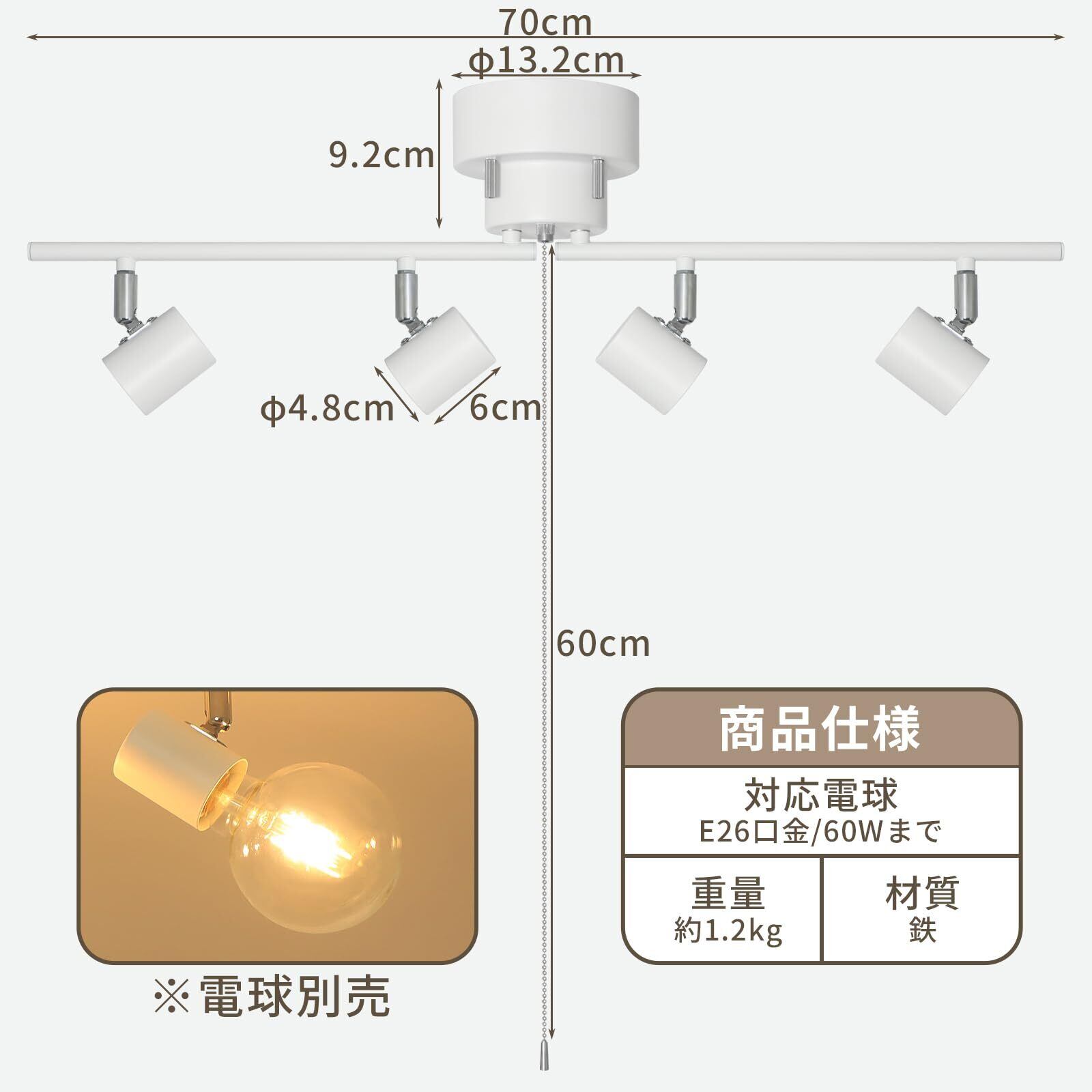 【商品の仕様】商品名:シーリングスポットライト 4灯 サイズ:幅70×奥行13.2×高さ22cm 材質:鉄 重量:約1.2kg 対応電球:E26口金/60Wまで ※ご注意:電球別売り