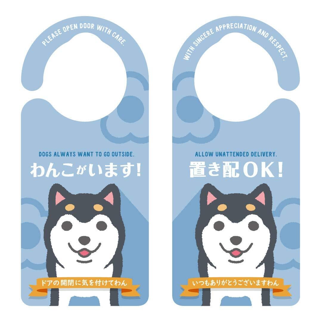 ヘキサゴン ドアノブプレート 置き配 わんこがいます 黒色 柴犬 日本製 約20.7×9.2×0.9cm 1104