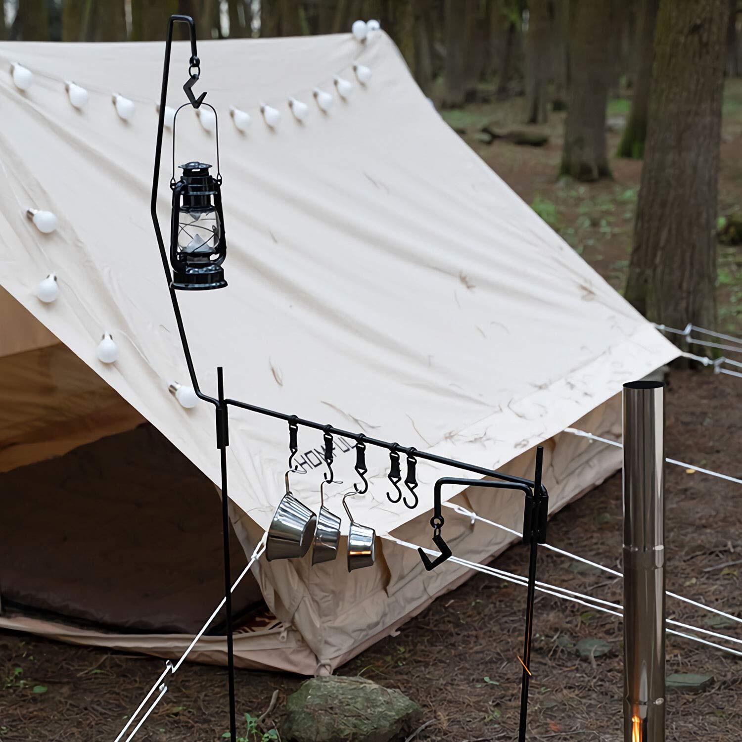【多機能】2個の取り外し可能なランタンハンガー付き、ランタンスタンドだけではなく、付属の4つのもの掛け用フックを合わせて、バーベキュー、キャンプ等のアウトドア活動の時にキッチン用具、雑物の整理用のハンギングラック、屋外で洗濯物を干す用のハンガーラックとして使用できます。
