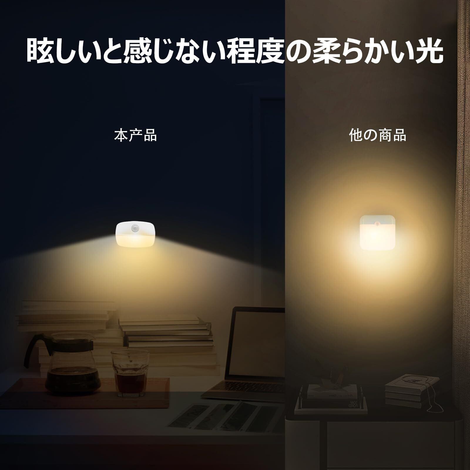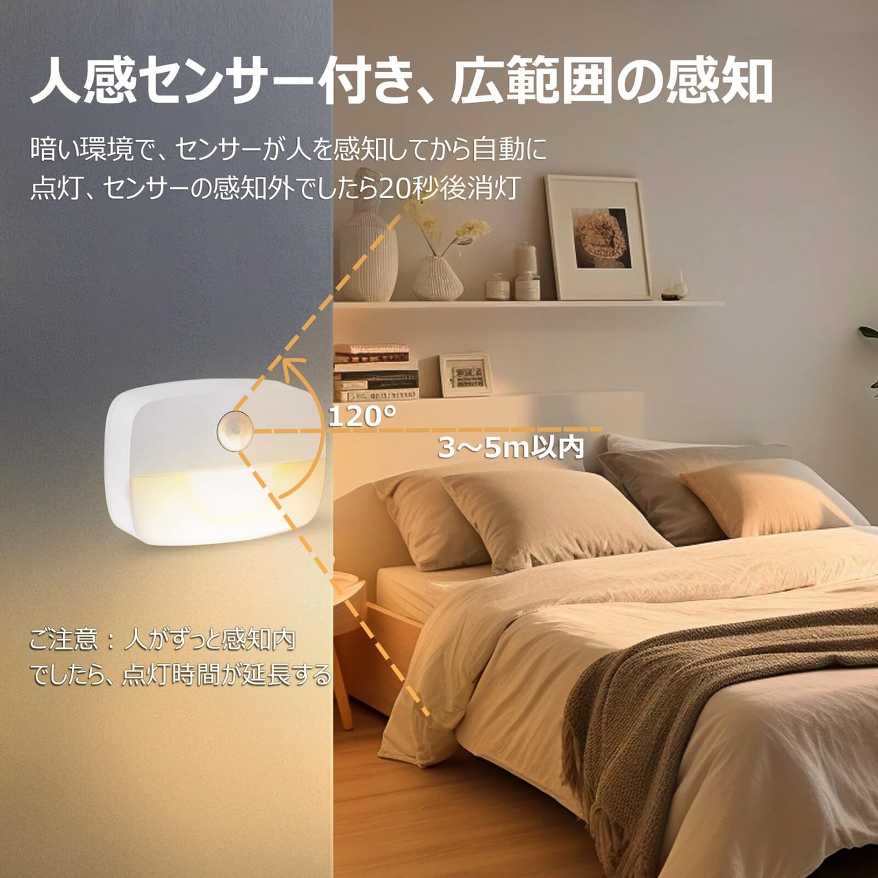 【感知範囲】暗くなると120°の広角範囲とおよそ3メートルの距離内の動きを検知したら点灯します。暗い室内や廊下、階段も、安心で危なげなく移動することができます。 ナイトライトとしても使います。