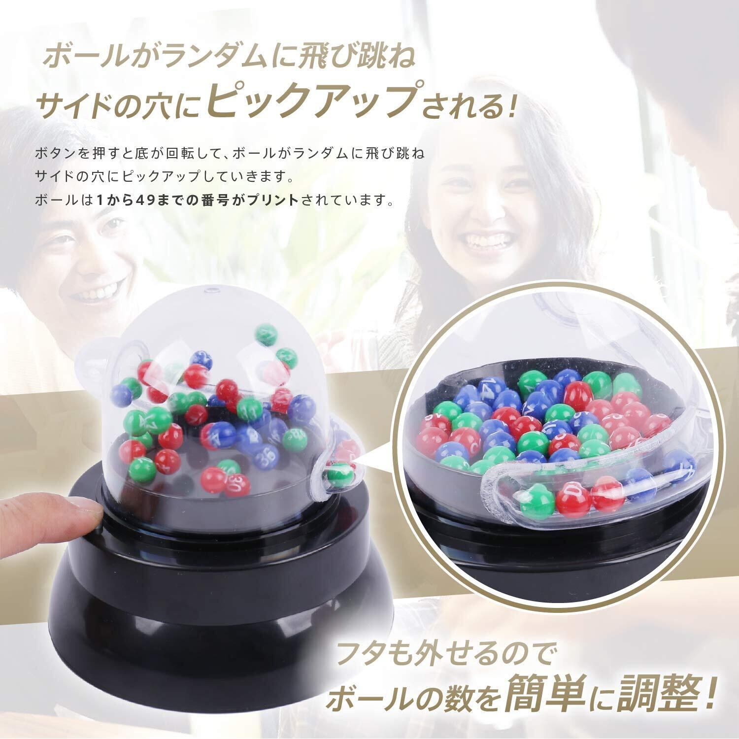 コンパクトな本体のボタンを押すと、ランダムで数字付きボールが飛び跳ね、サイドの穴にピックアップ。ボールは、ロトにあわせて1から49までの番号がプリントされています。(49番までであれば、ビンゴゲームなど他の遊びにも使えます)