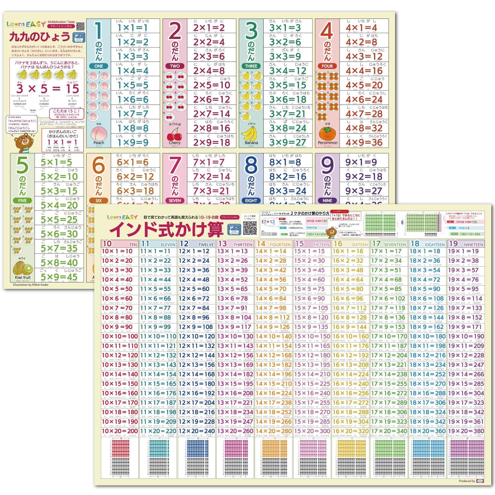 2枚セット 九九の表・インド式かけ算表 目で見てわかって英語も覚えられる お風呂用ポスター 音声QRコード 大きい A2サイズ 小学生 学習 算数ポスター