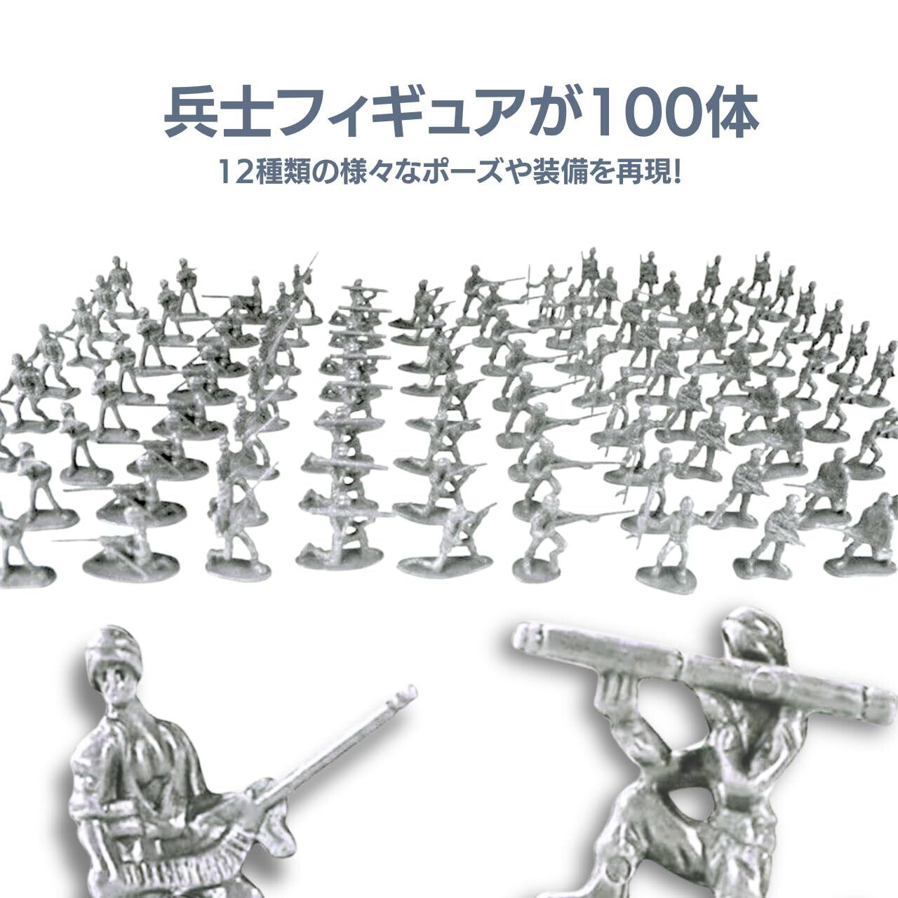 兵士フィギュアが100体:この軍隊フィギュアセットは、兵士フィギュアが100体揃ったコレクションで、12種類のフィギュア種類で様々なポーズや装備を再現、豊富なバリエーションが実現