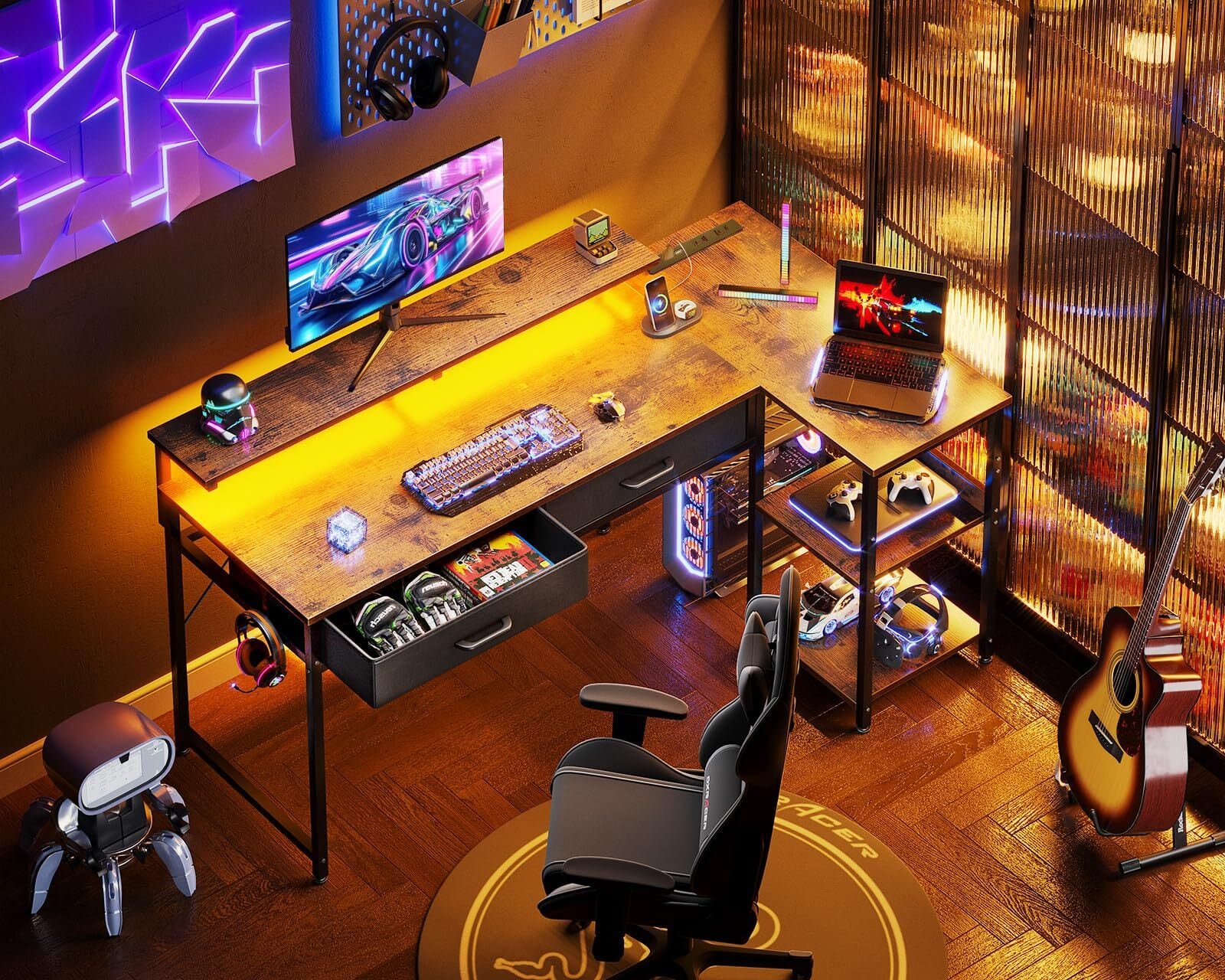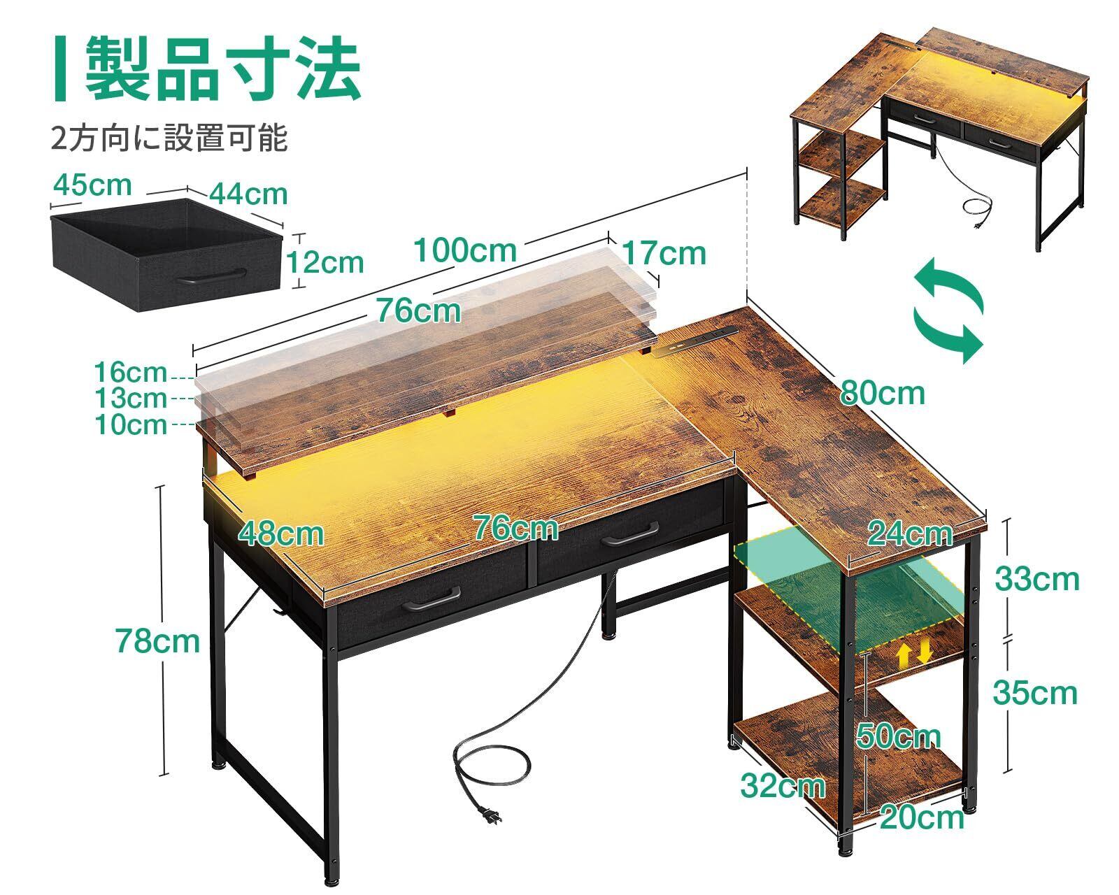 AODK L字デスク ゲーミングデスク パソコンデスク 100cm幅 コンセント付き RGBライト付き モニター台付き 棚高さ調節可能 右棚左棚 大型PCデスク 収納力 引き出し2杯 オープンシェルフ設計 作業&ゲームに最適 ゲームデスク ビンテージ