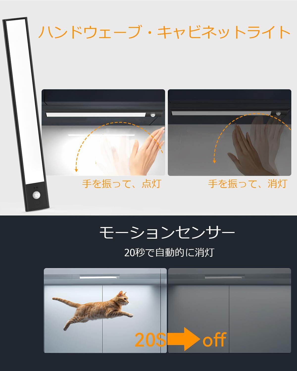 【モーションセンサーと手波センサー】人感センサーライトには2種類のセンサーがあります。AUTO(自動)モードで、3m/120°の範囲内の運動が検出されると自動的にオンになります。約20秒以内に何の動作も検出されないと、キャビネットライトがオフになります。手波センサーを起動した場合、持続時間は180秒、2-8CMの距離で手を振るだけで簡単にオン/オフにします。