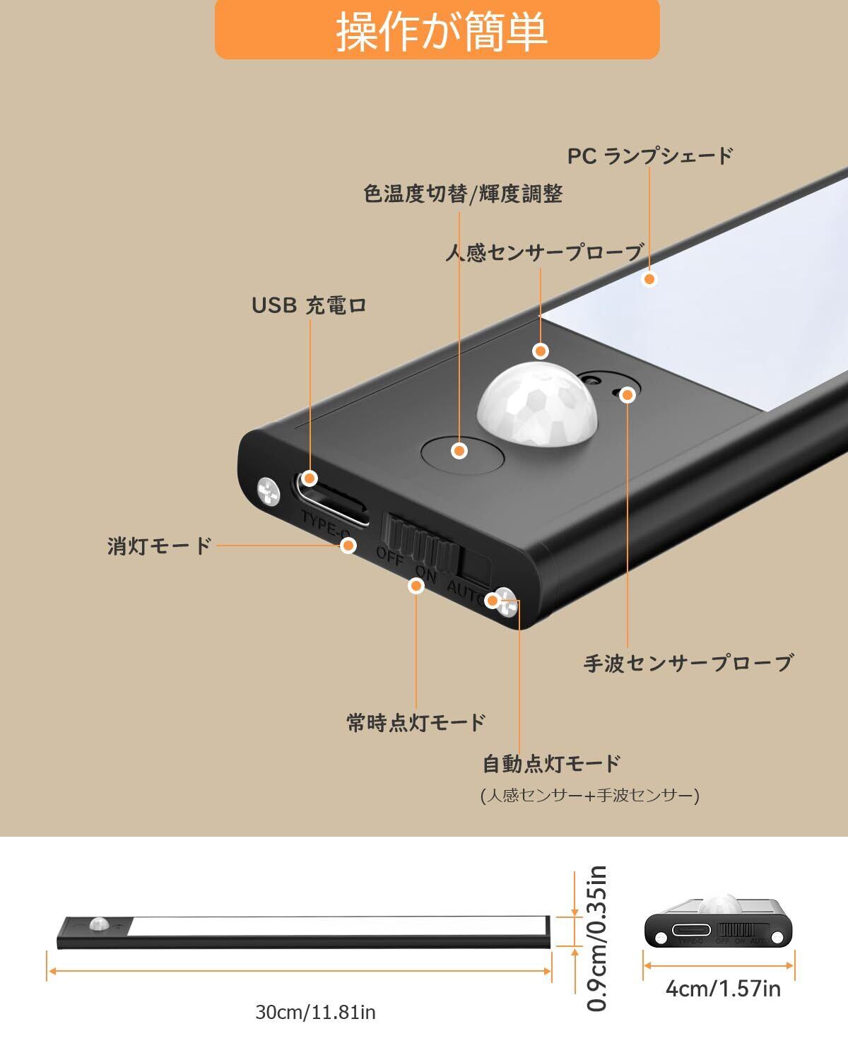 【連続点灯60時間】 人感センサーライト 室内 充電式 マグネット LEDバーライト 読書灯 棚下 Type-C 充電式 無段階調光 キッチン用 屋内 寝室 廊下 階段 玄関 階段 3000K/4500K/6000K 電球色 昼白色 昼光色調整 30cm ブラック 2本
