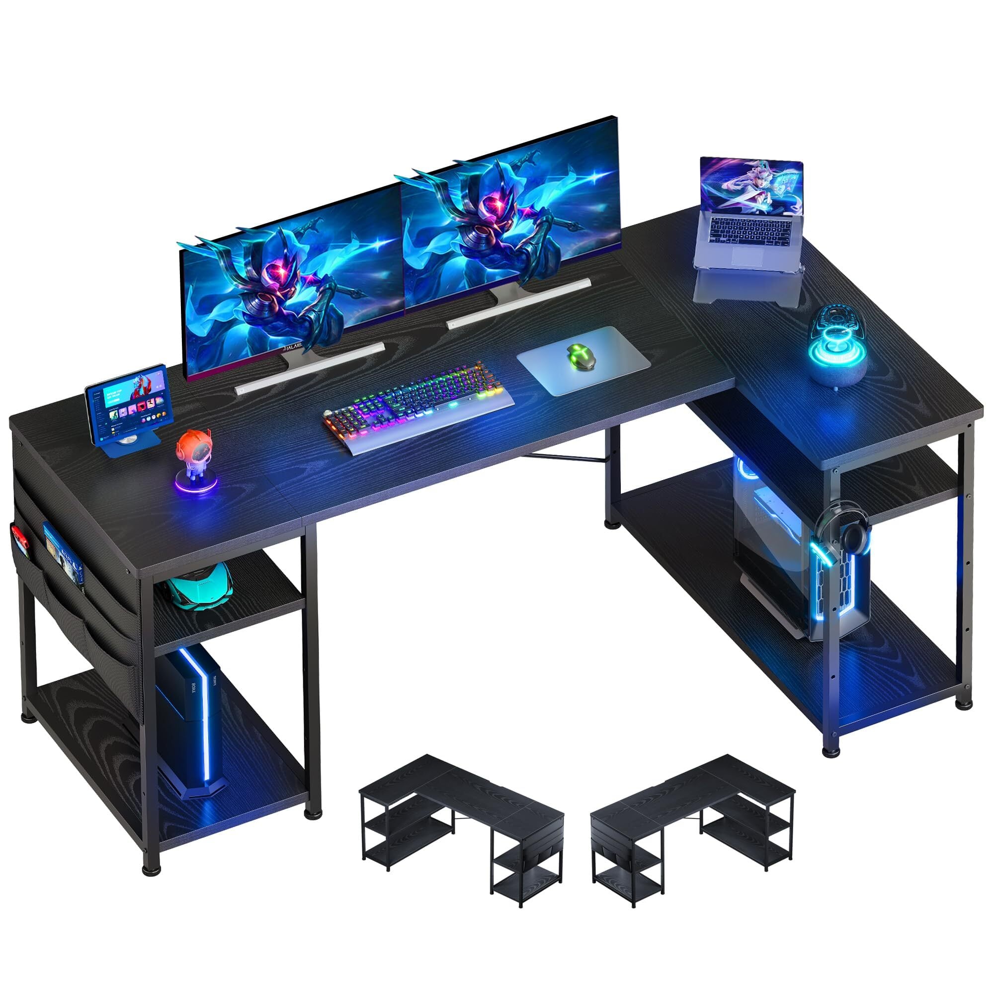 YeTom l字デスク ゲーミングデスク デスク 幅150cm pcデスク コーナーデスク 棚板高さ調節可能 収納袋付き L字型 PC 勉強机 作業 在宅勤務 リモートワーク ゲーム 書斎 収納ラック付き 黑い