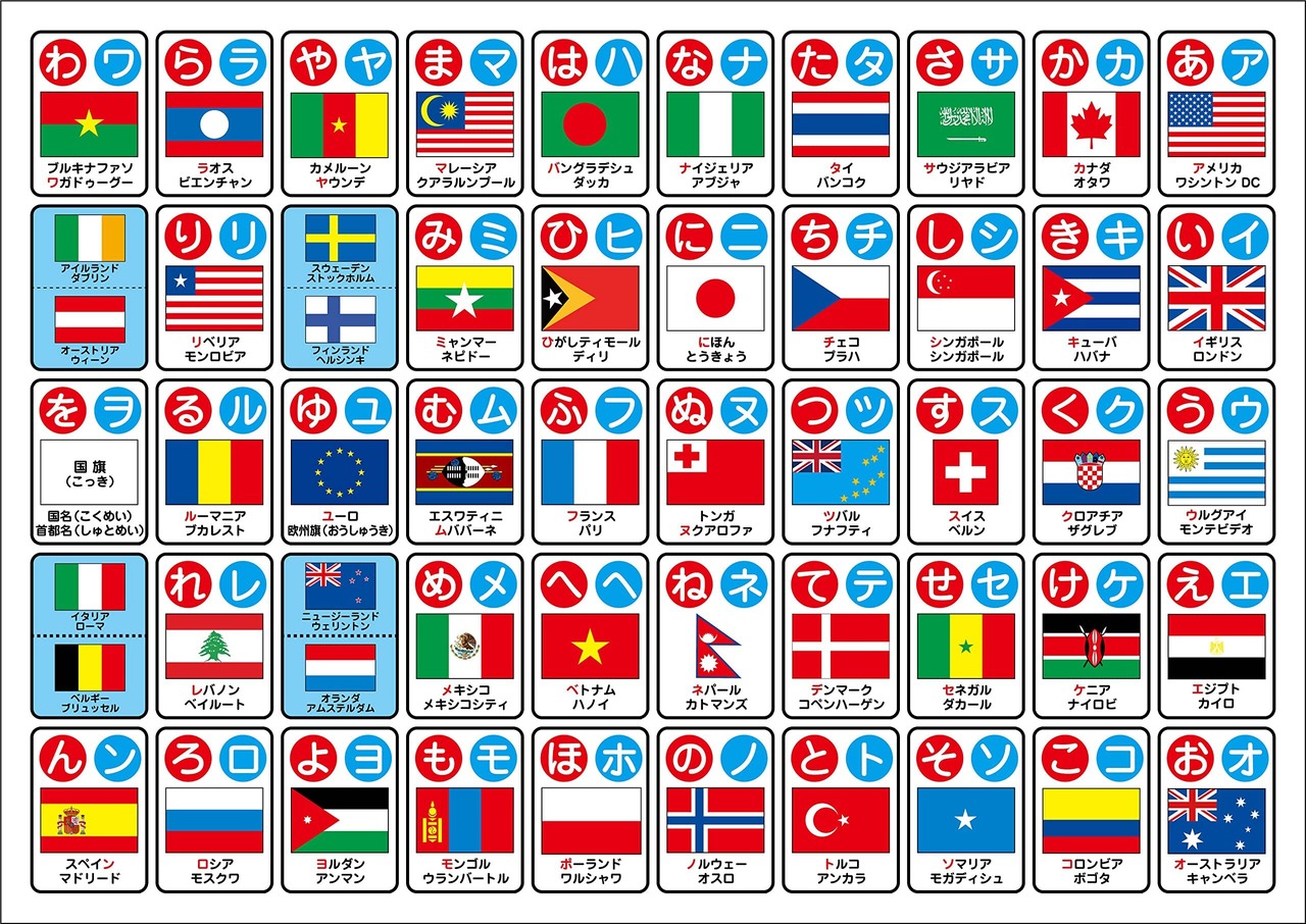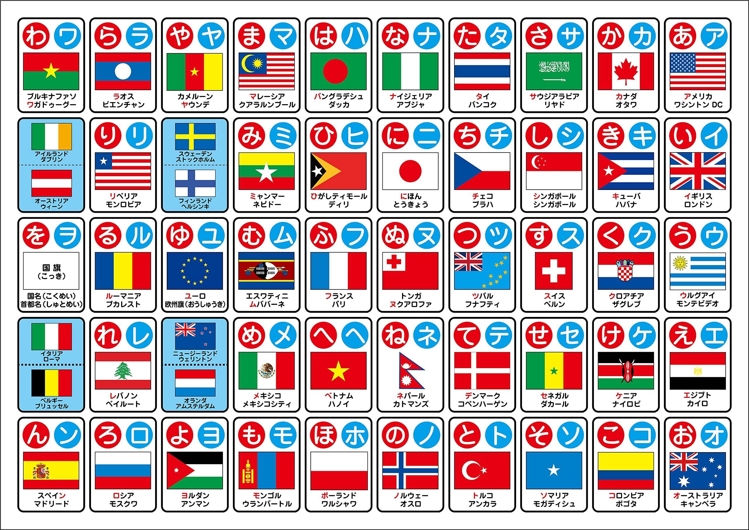 【特 徴】国旗から国名と首都を覚えながら楽しくひらがな・カタカナ50音も学習できます。通常の「アイウエオ」ポスターよりもレベルは高いですが、学習意欲の高いお子様にオススメです。