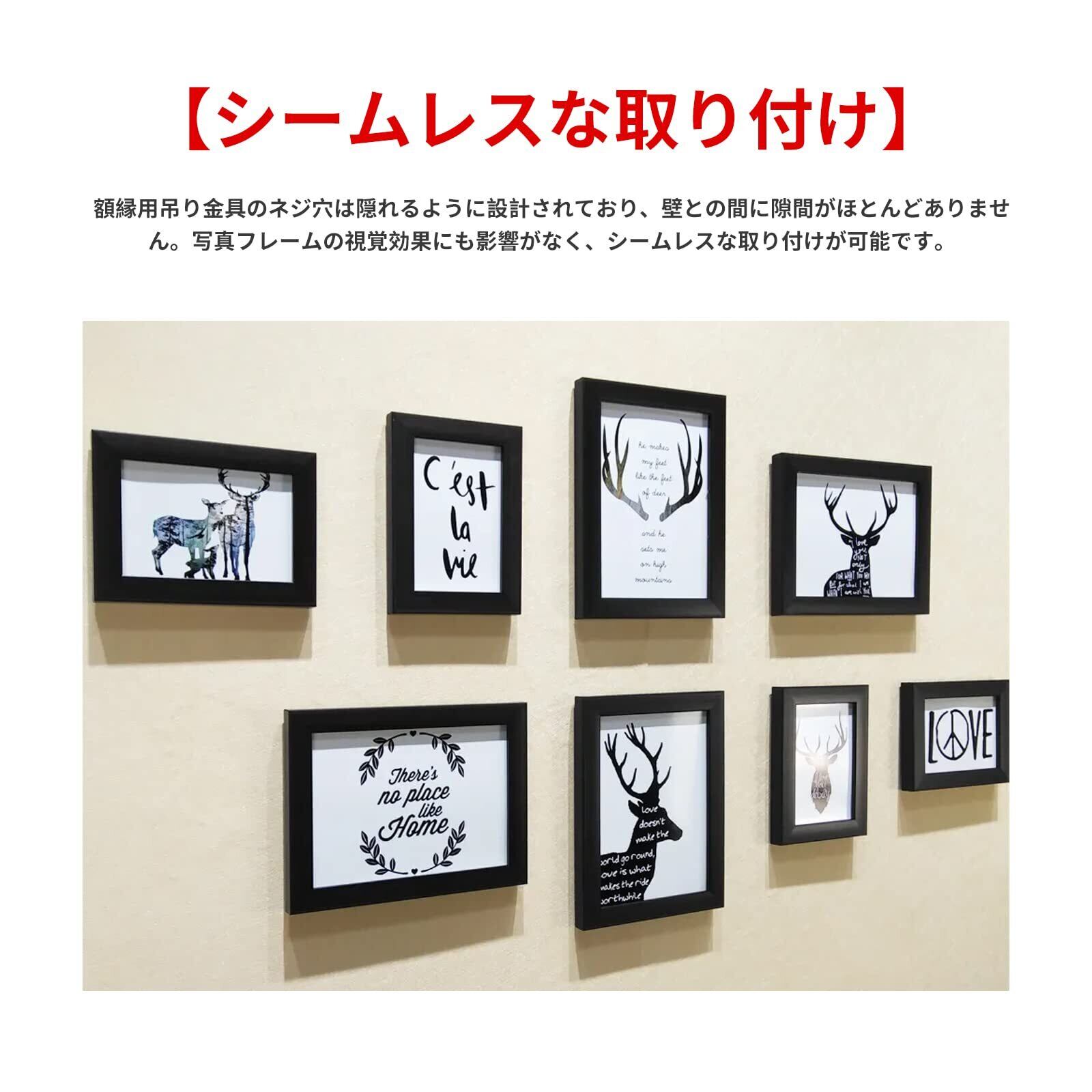 【シームレスな取り付け】額縁用吊り金具のネジ穴は隠れるように設計されており、壁との間に隙間がほとんどありません。写真フレームの視覚効果にも影響がなく、シームレスな取り付けが可能です。