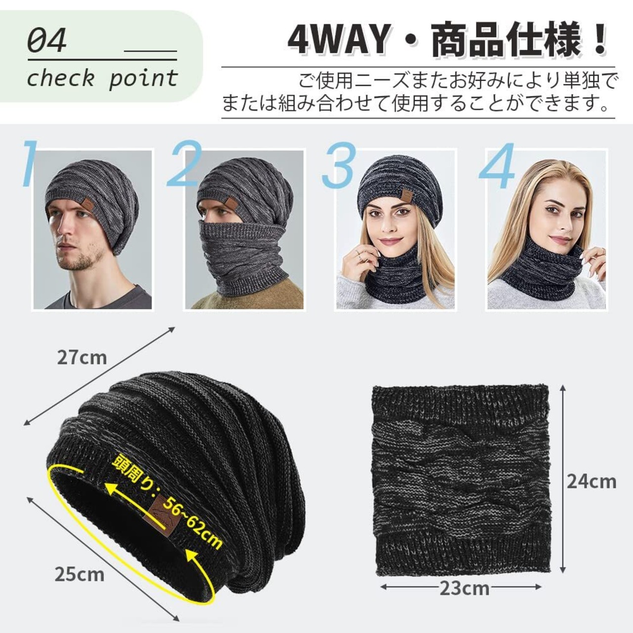【3WAY着用スタイル】帽子は2本セット「ニット帽子+ネックウォーマー」なので、ご使用ニーズまたお好みにより単独でまたは組み合わせて使用することができます。少し厚手の生地が被り心地よくて、防寒対策にもバッチリです。おしゃれデザインのニット帽、ネックウォーマーは防寒だけでなくファッションアイテムとしても大活躍。