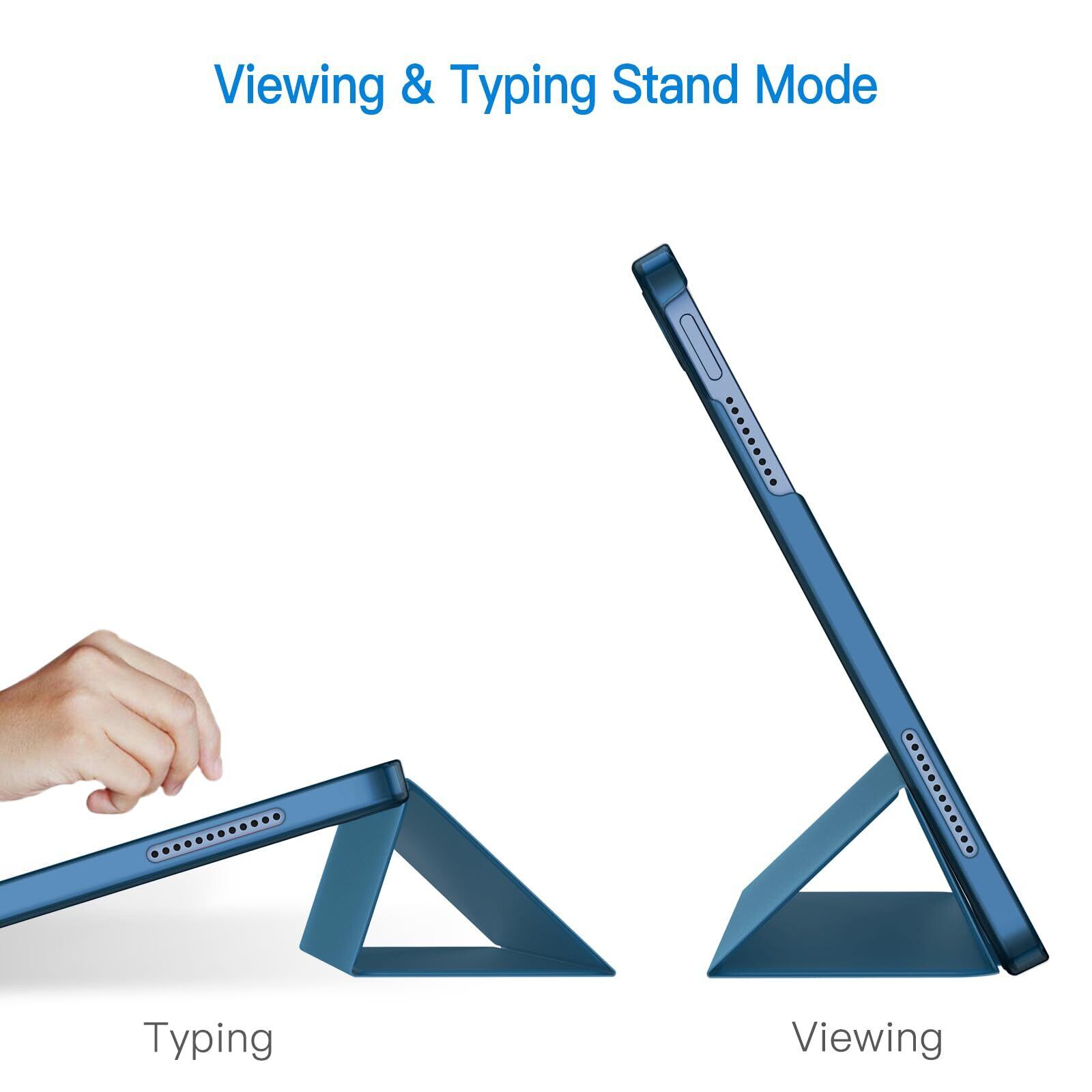 マグネット内蔵、オートスリープとオートウェイクアップ機能が付きます。三つ折りフロントカバーにより、視聴とタイピングに合わせた2つスタンド角度を調整できます