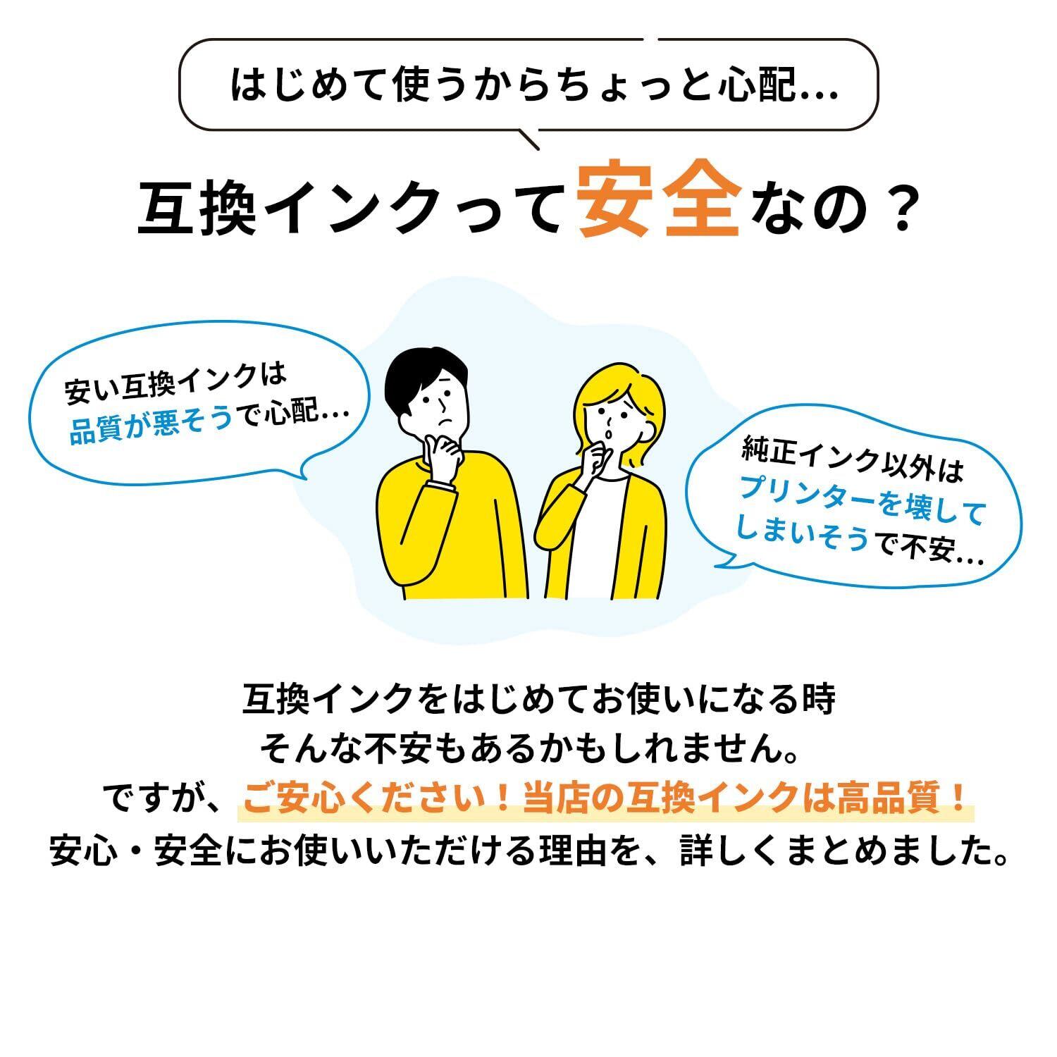 [商品詳細] ・本製品は純正品と同様にご利用いただける互換インクカートリッジです。メーカー純正品ではございません。プリンタの相性問題の原因となる「ICチップ」は、業界最大手のAPEX社製の最新バージョンのICチップを採用し、高い安定性を実現しています。・インクには純正品と同様、文字やグラフがくっきりと印刷できる全色顔料インクを採用しております。・流動性・発色のよい「HDカラー」インクを使用しております。プリントヘッドにやさしく、プリンターの寿命を縮めることはありません。・印刷枚数は純正の大容量サイズと同じ、ブラック約2,200枚・カラー約1,100枚の印刷が可能です。(ISO/IEC 19798 に基づく)カラ打ち防止のためにインクが多めに填充されております。使用後にカートリッジ内にインクが残っても異常ではありません。