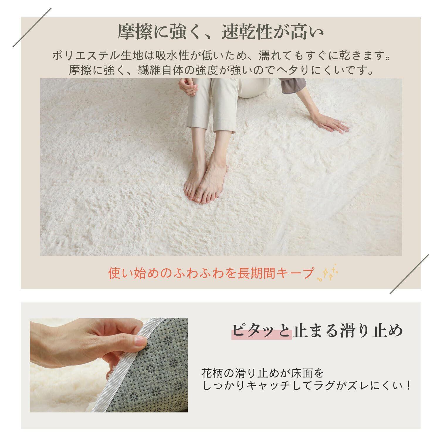 ・【商品の特徴】ふわふわシャギー、オシャレなカラー、ラビットファーのような手触り、お手入れ簡単、毛が抜けにくい、滑り止め付き、ホットカーペット対応、床暖房対応、オールシーズン、手洗い可能