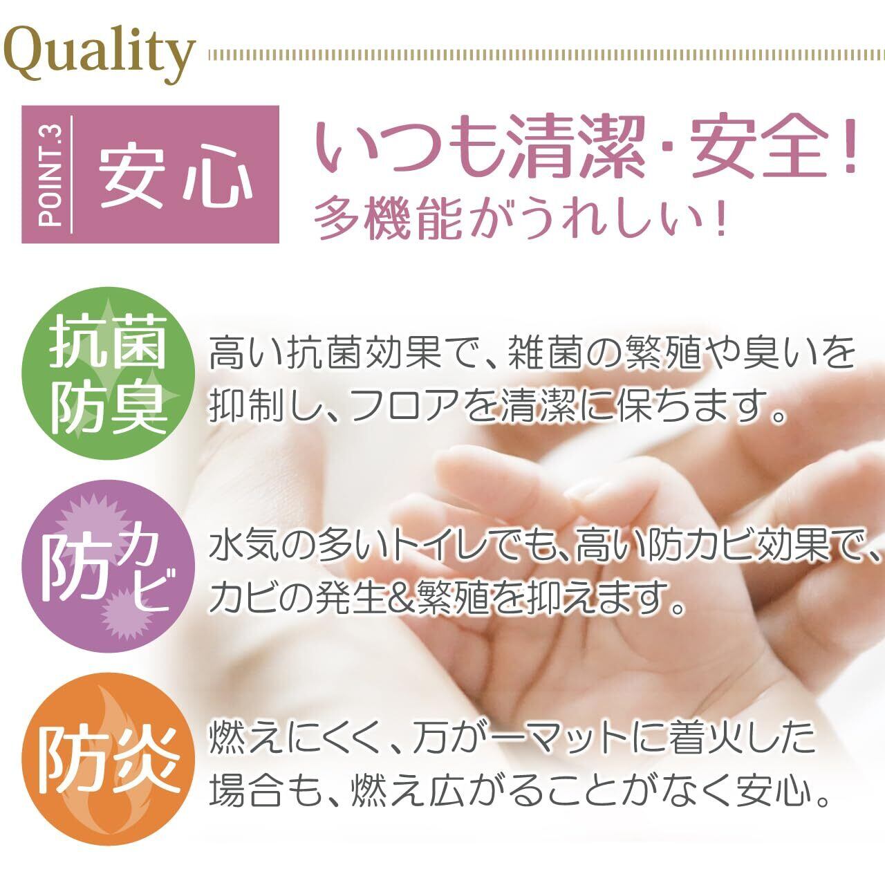 【抗菌防臭・防カビ・防炎】高い抗菌防臭・防カビ効果で、マットを清潔に保ちます。防炎効果もあるので、燃えにくく万が一着火した場合も、燃え広がることがなく安心。